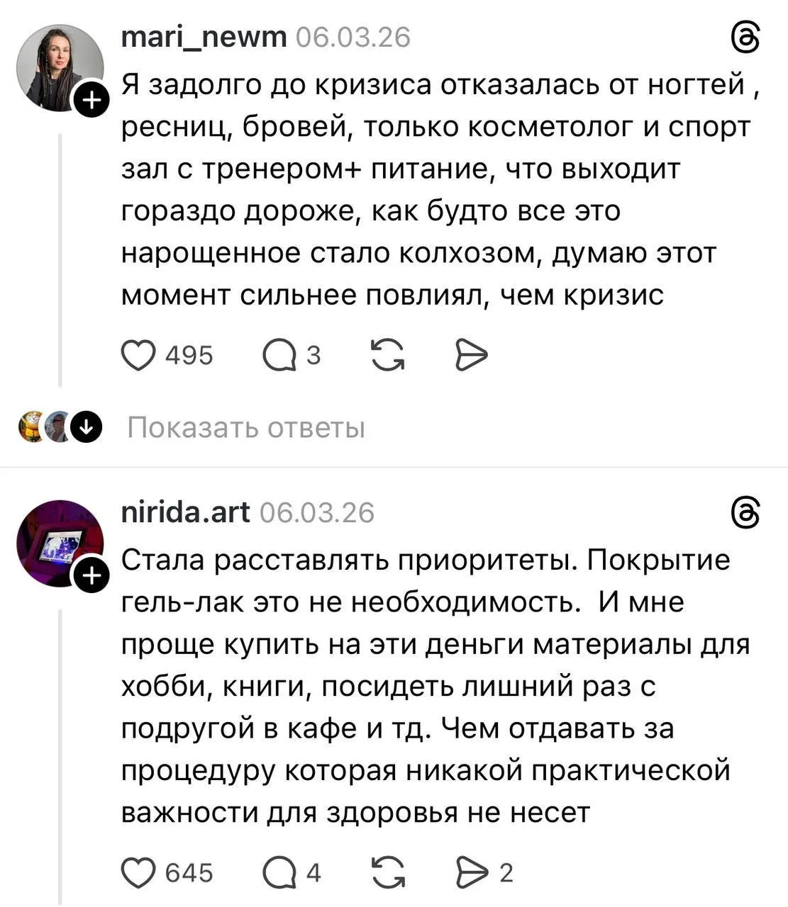Но даже я начала пересматривать какие-то вещи. Например, этой зимой спокойно отказалась от педикюра — и мир не рухнул.