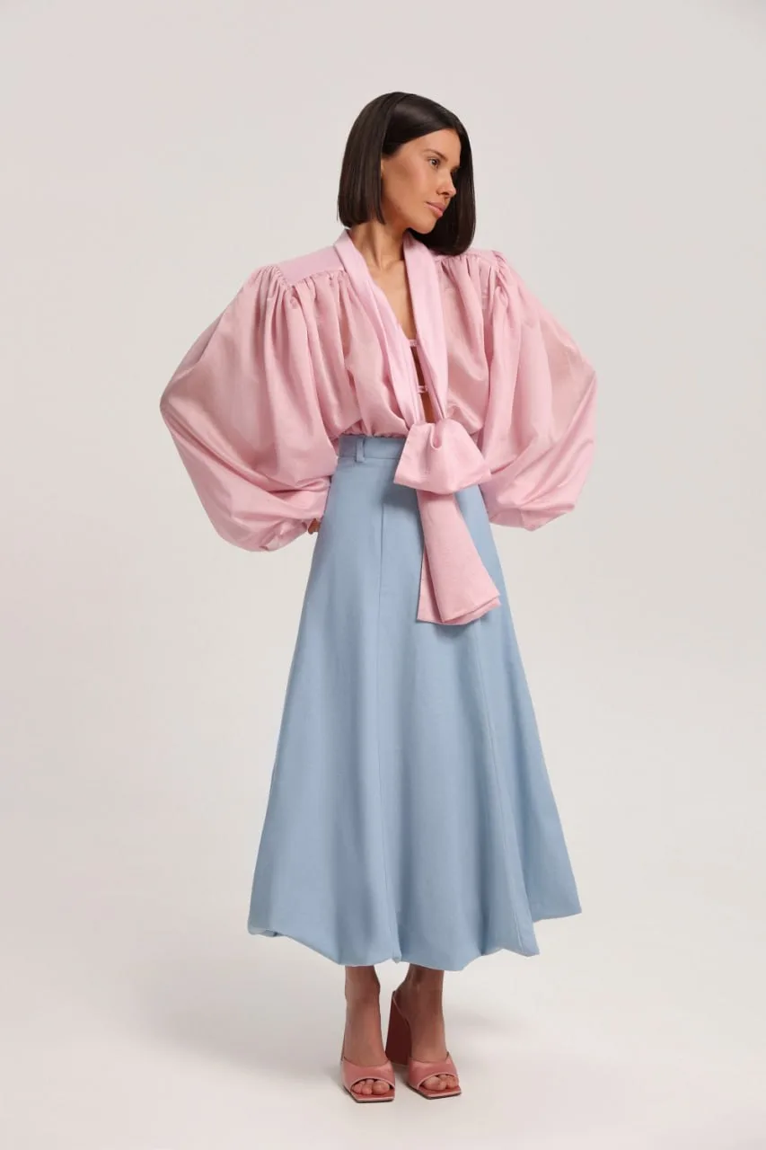 Сара Пиджон в Balenciaga — пудровое платье-баллон без внутренней архитектуры. Авангард работает только тогда, когда внутри есть конструкция. Если её нет, объём съедает фигуру и образ разваливается.
