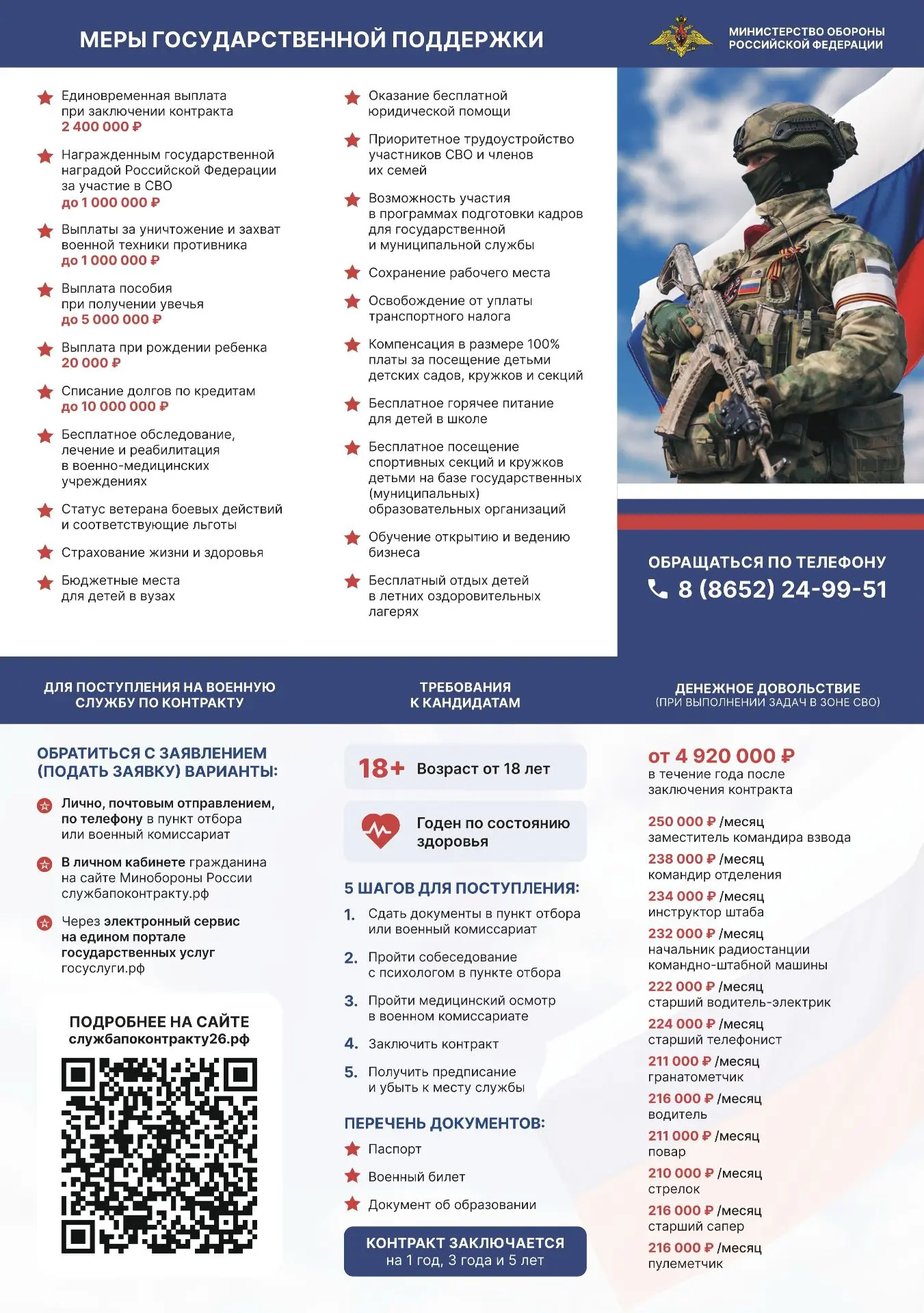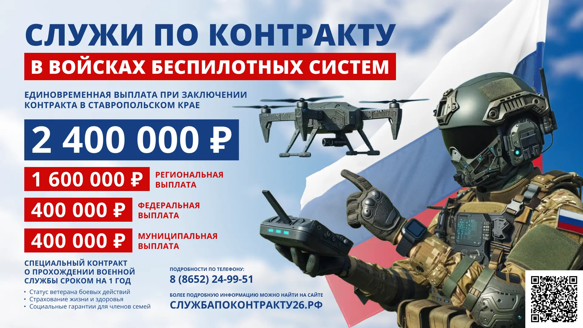 Граждане, подписавшие контракт с Министерством обороны РФ в Военном комиссариате города Невинномысска Ставропольского края с 01 января 2026 года, дополнительно получат единовременную денежную выплату из бюджета города Невинномысска в размере 400 000 рублей.