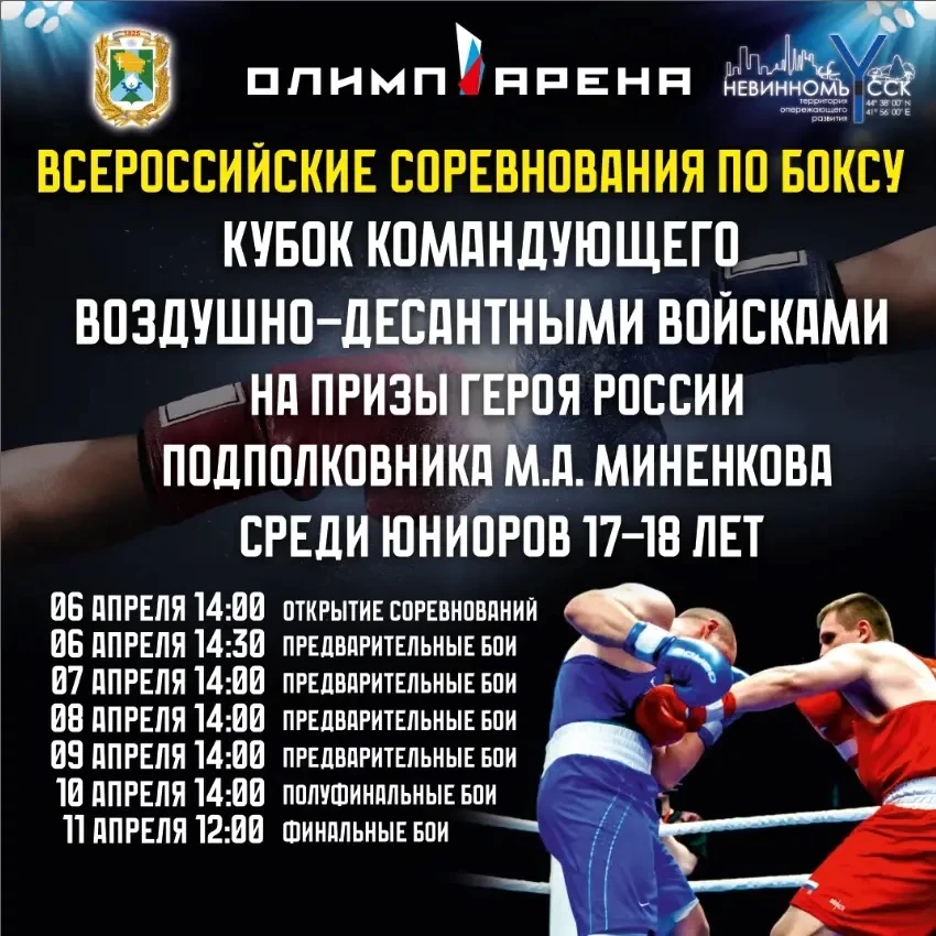 6-11 апреля спортивно-культурный комплекс «Олимп» примет участников Всероссийских соревнований по боксу «Кубок командующего воздушно-десантными войсками на призы Героя России, подполковника М.А. Миненкова среди юниоров 17 – 18 лет.»