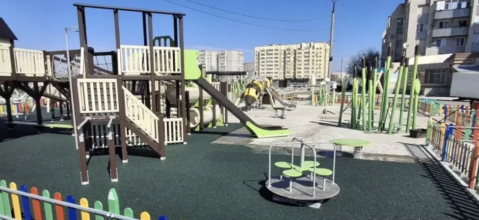 Сегодня на объекте ведётся укладка нижнего слоя резинового покрытия на детской площадке. Такое покрытие — современное и безопасное решение для наших детей: