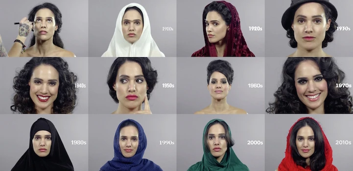 Всего за одну минуту модель Сабрина воплотила в себе радикально отличающиеся идеалы женской иранской красоты с 1910 по 2010-е года.
