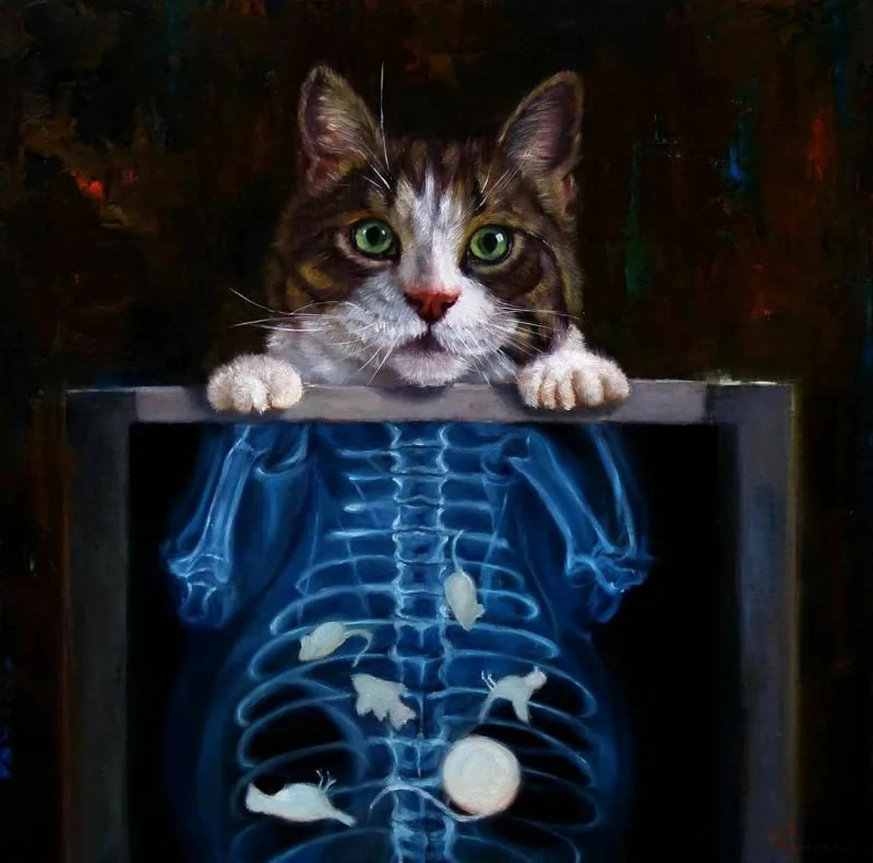 Картины художницы оживляют забавные маленькие моменты, которые могут произойти только в мире, где животные ведут себя как мы: зайка, примеряющая платье перед зеркалом или кот-спасатель, оберегающий группу рыбок в аквариуме от того, чтобы те утонули.
