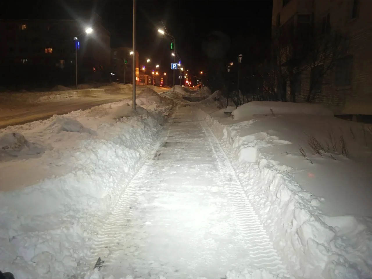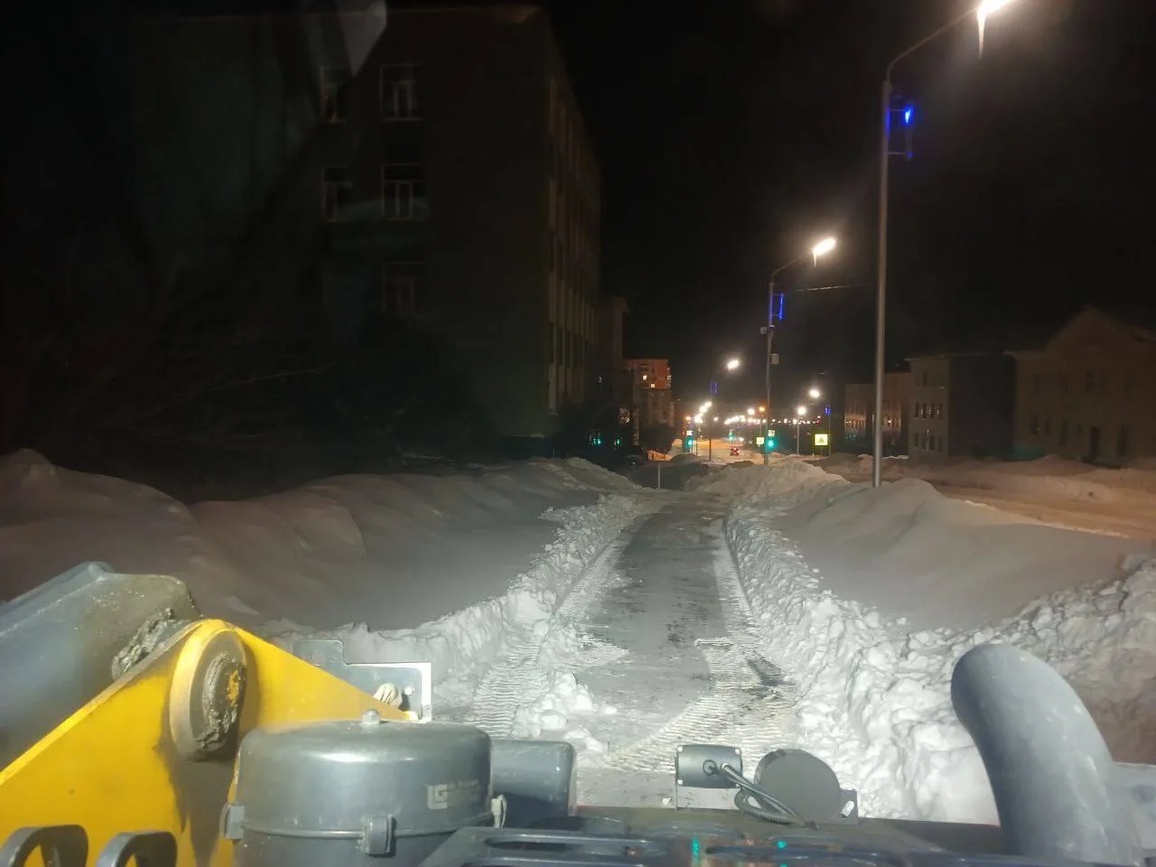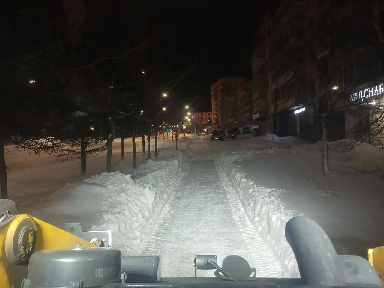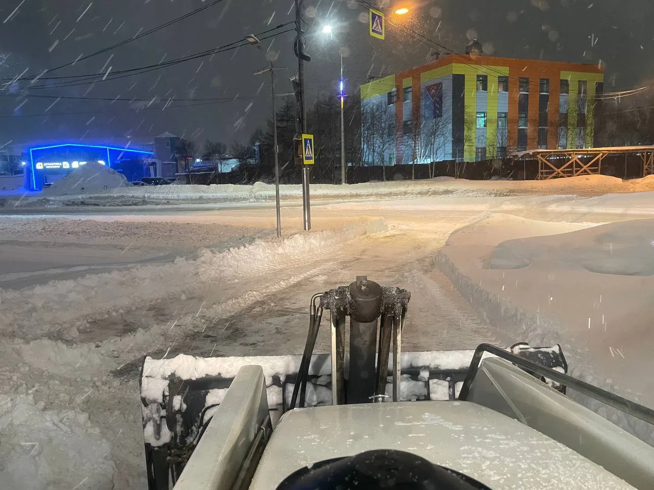 Ночью техника КЗХ расчищала тротуары на улице Якутской, проспекте Карла Маркса (от Парковой до Дзержинского), на Колымском шоссе, а также работала на пешеходной зоне у спорткомплекса «Президентский».
