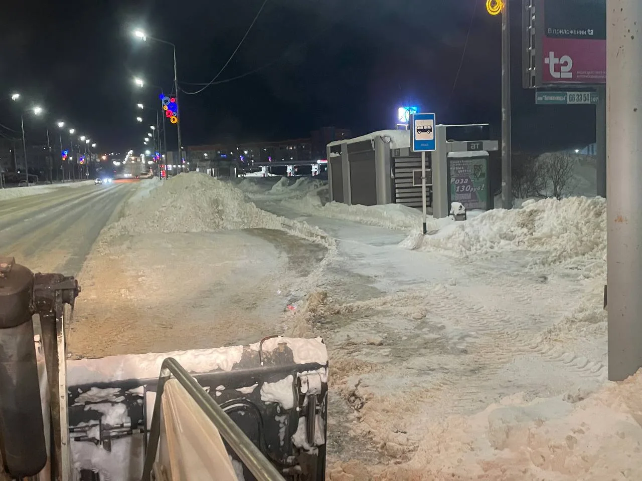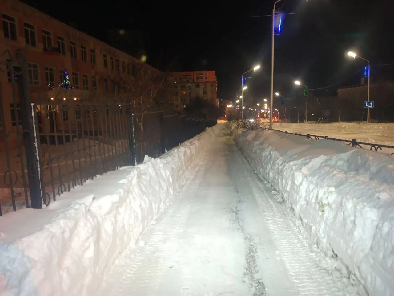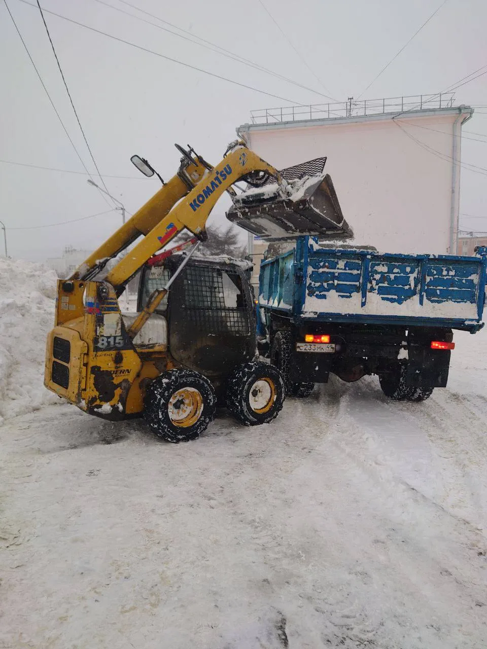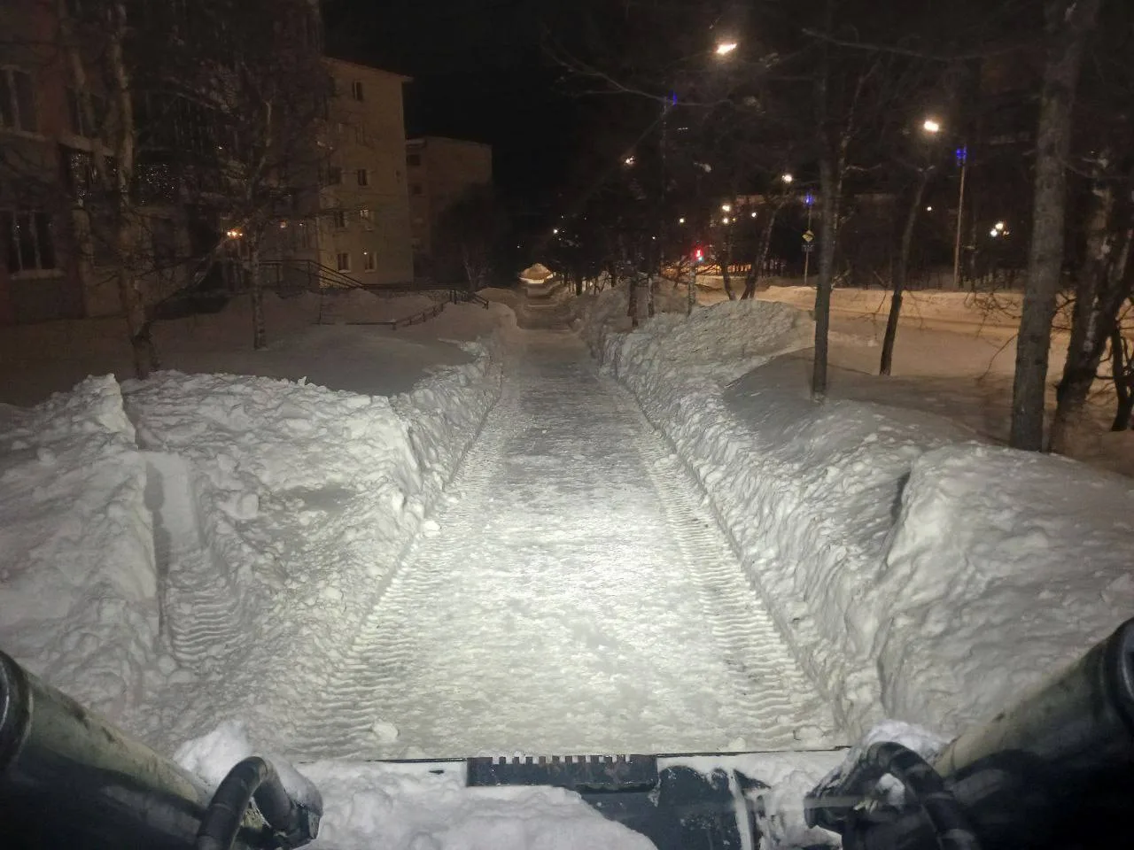 Ночью техника КЗХ расчищала тротуары на улице Якутской, проспекте Карла Маркса (от Парковой до Дзержинского), на Колымском шоссе, а также работала на пешеходной зоне у спорткомплекса «Президентский».