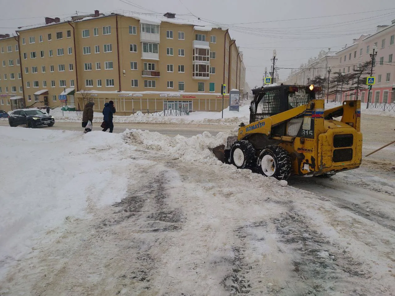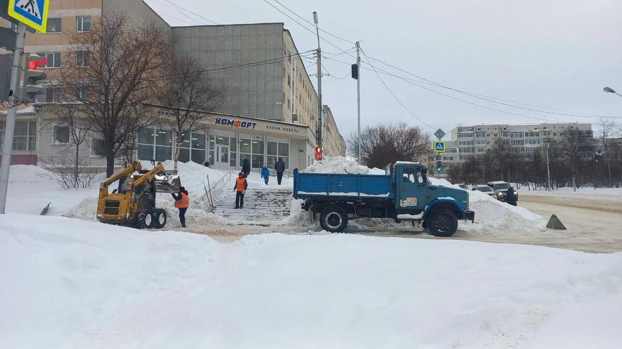 С привлечением спецтехники ведётся уборка и вывоз снега на пешеходных переходах в районе улиц Портовой и Дзержинского.