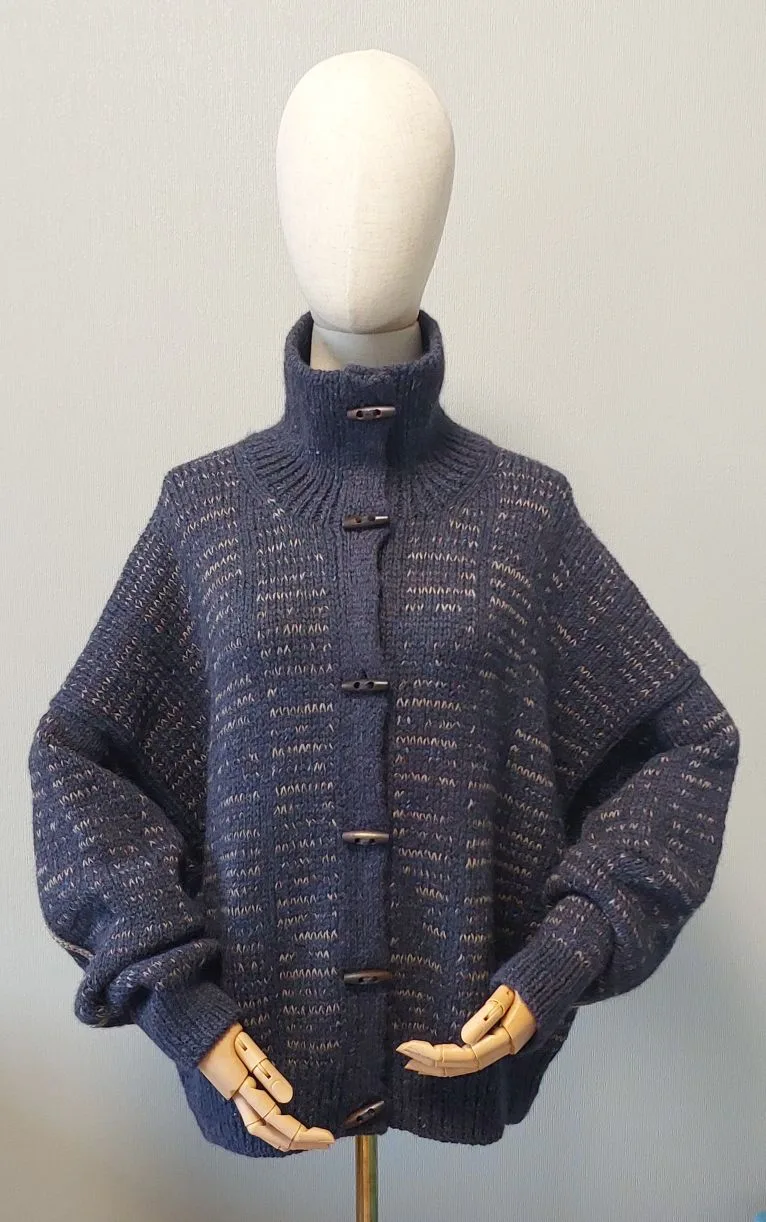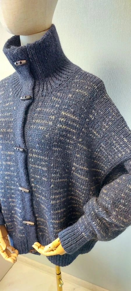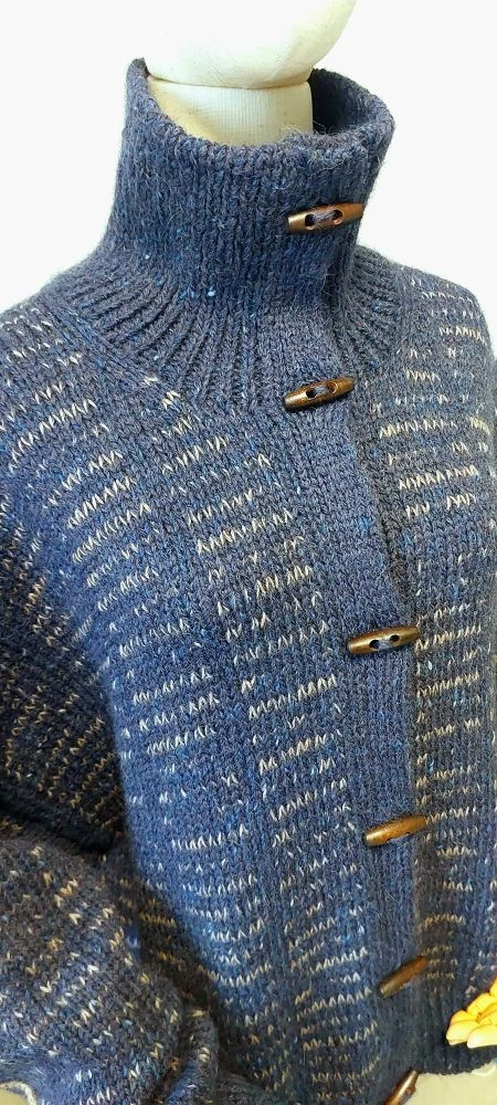 Технически очень сложная работа. Нет ни одного шва, анатомический крой, жаккард и интарсия в круговых рядах (это вообще ребус не для слабонервных), цельновязаная двойная планка с вертикальными отверстиями для пуговиц, которая присоединяется в процессе создания, а не когда уже готова... Я уже молчу о том, что описание было на английском языке...