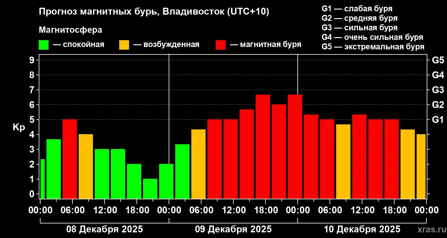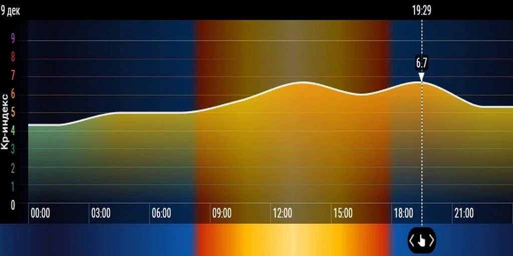 Наибольший балл геомагнитной активности ожидается 9 декабря с 13:00 по 16:00, на уровне 6.67 из 9 (Сильная магнитная буря), затем в ночь с 9 на 10 декабря около полуночи. Готовьтесь!