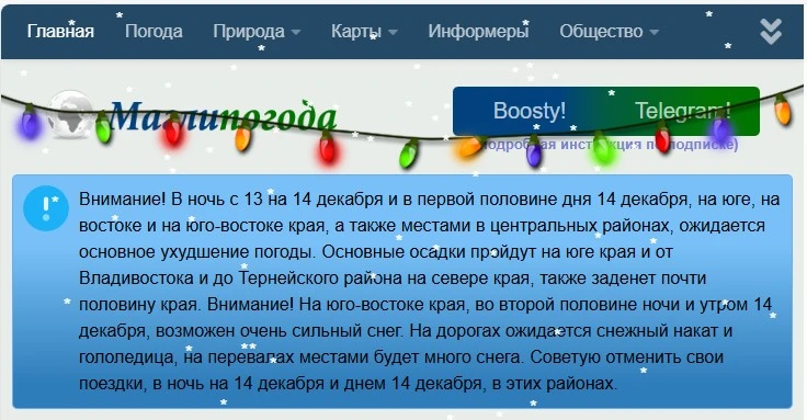 Внимание! В ночь с 13 на 14 декабря и в первой половине дня 14 декабря, на юге, на востоке и на юго-востоке края, а также местами в центральных районах, ожидается основное ухудшение погоды. Основные осадки пройдут на юге края и от Владивостока и до Тернейского района на севере края, также заденет почти половину края. Внимание! На юго-востоке края, во второй половине ночи и утром 14 декабря, возможен очень сильный снег. На дорогах ожидается снежный накат и гололедица, на перевалах местами будет много снега. Советую отменить свои поездки, в ночь на 14 декабря и днем 14 декабря, в этих районах.