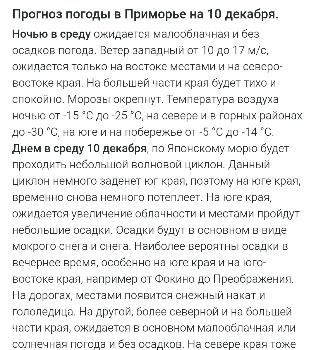 Основное ухудшение погоды в Приморском крае, ожидается в ночь с 13 на 14 декабря и днем 14 декабря. 15 декабря погода резко успокоится. 16 и 17 декабря ожидается обычная зимняя и в основном без осадков погода. Далее в Приморье придет снова весна и установятся плюсовые температуры во многих районах края. Ну а в завершении неделе, на Приморье может выйти мощный циклон. Читайте все подробно по подписке: