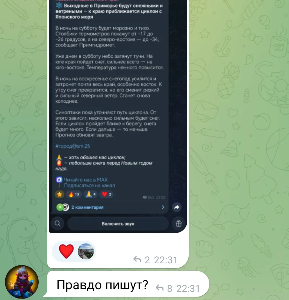 Циклон уже вышел в Японское море и скоро на юге края начнется снег. Напоминаю, что основное ухудшение погоды ожидается в ночь с 13 на 14 декабря и днем 14 декабря. ❄️🌨☃️🌬💨🌊