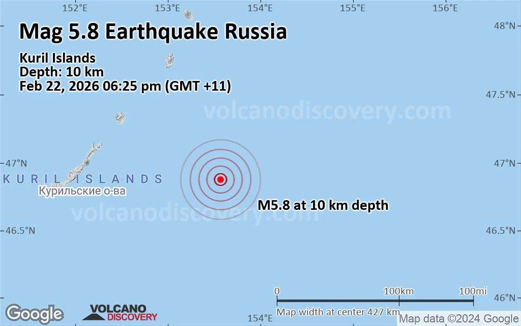 Внимание! На Курильских островах, в 17:25 произошло сильное землетрясение магнитудой 5.8
