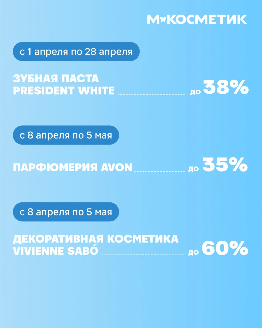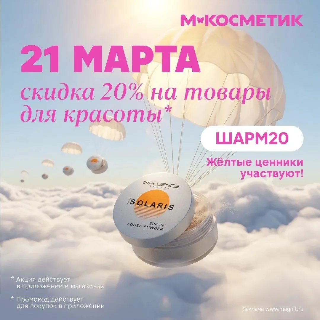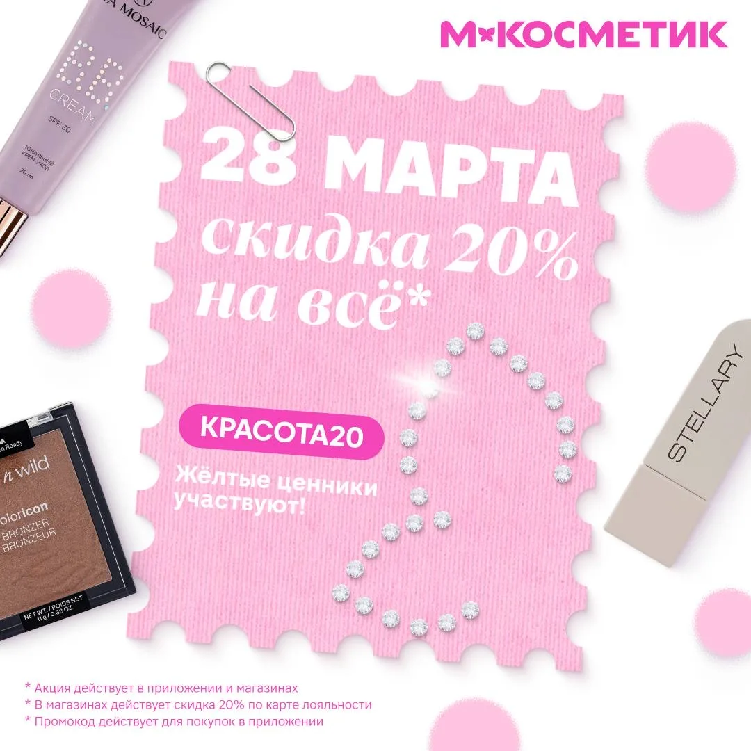 В субботу, 21 марта, в магазинах М.Косметик действует скидка 20%* на товары для красоты и желтые ценники: