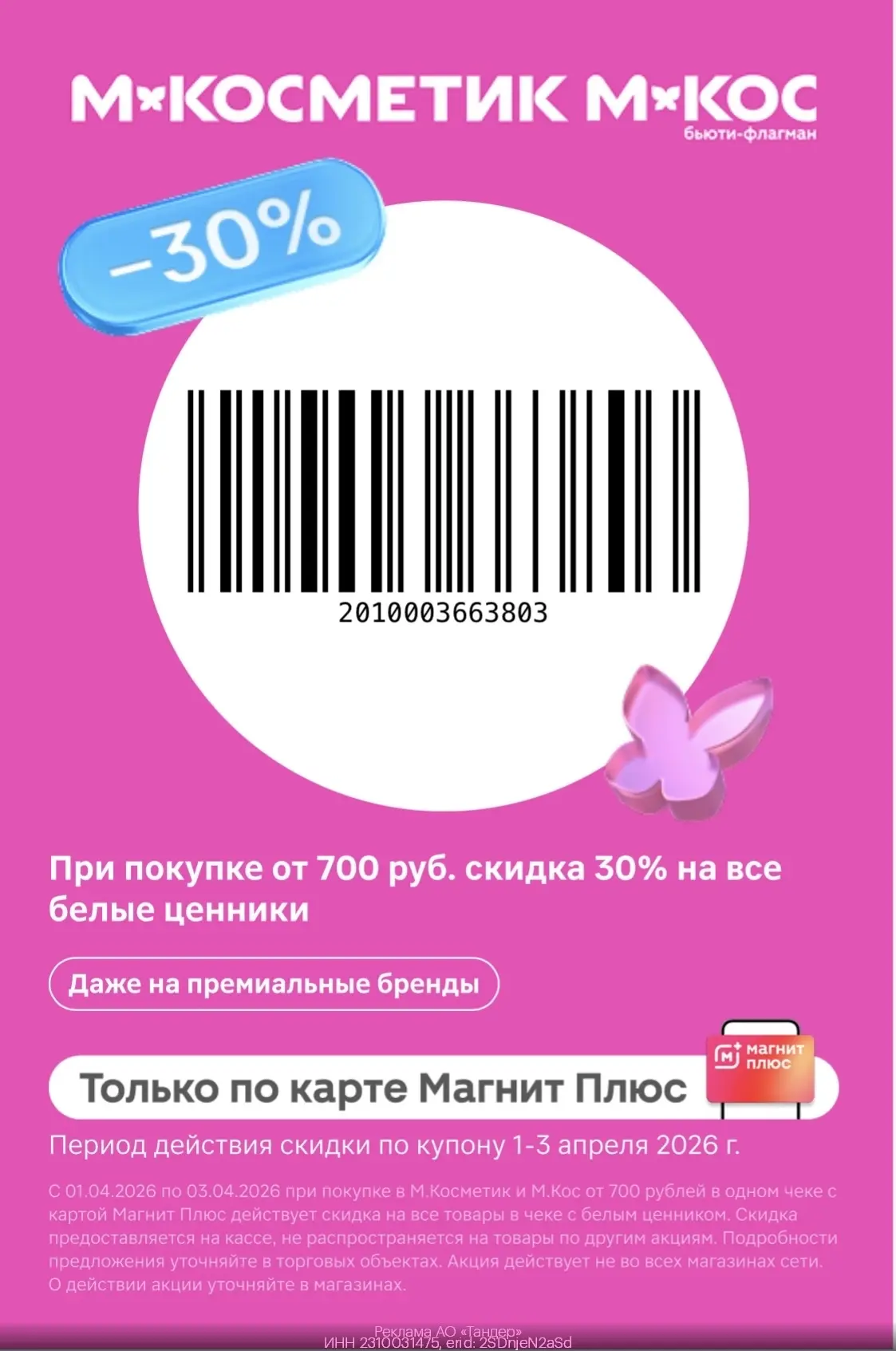 Покажите этот купон на кассе в «М.Косметик» и в «М.Кос» вместе с картой «Магнит Плюс» — и получите 30% скидку на ВСЕ товары с белыми ценниками при покупке от 700 ₽ в одном чеке!