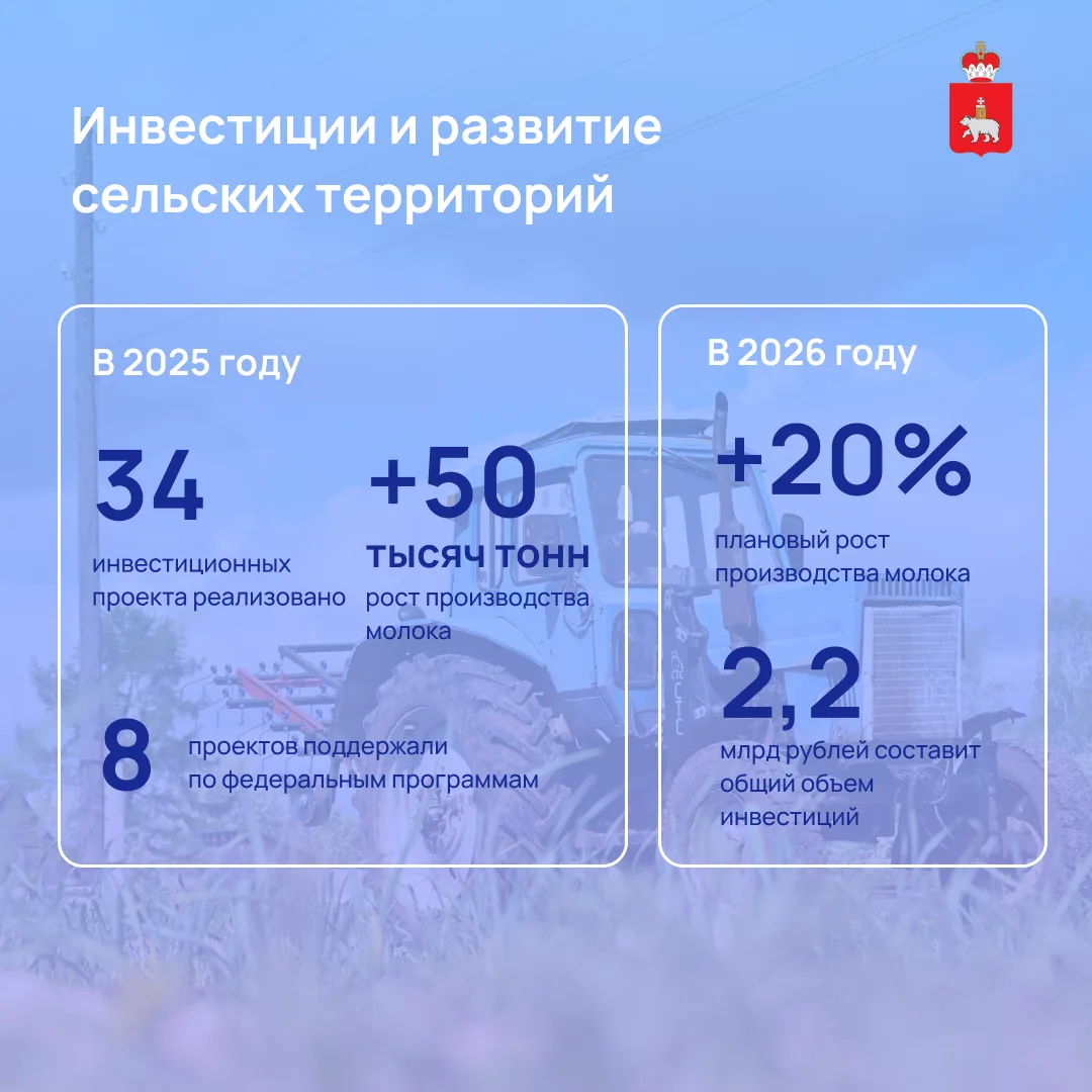 Также привлекаем средства на развитие инфраструктуры на селе. С помощью федеральной программы «Комплексное развитие сельских территорий» благоустроили почти 800 объектов и построили более 50 км дорог. В 2026 году благоустроим и возведем соцобъекты еще в 10 муниципалитетах края. Например, в Карагайском округе начнем строительство спортивного стадиона, а в Ординском — котельной. В обоих муниципалитетах также приступим к реконструкции очистных сооружений.