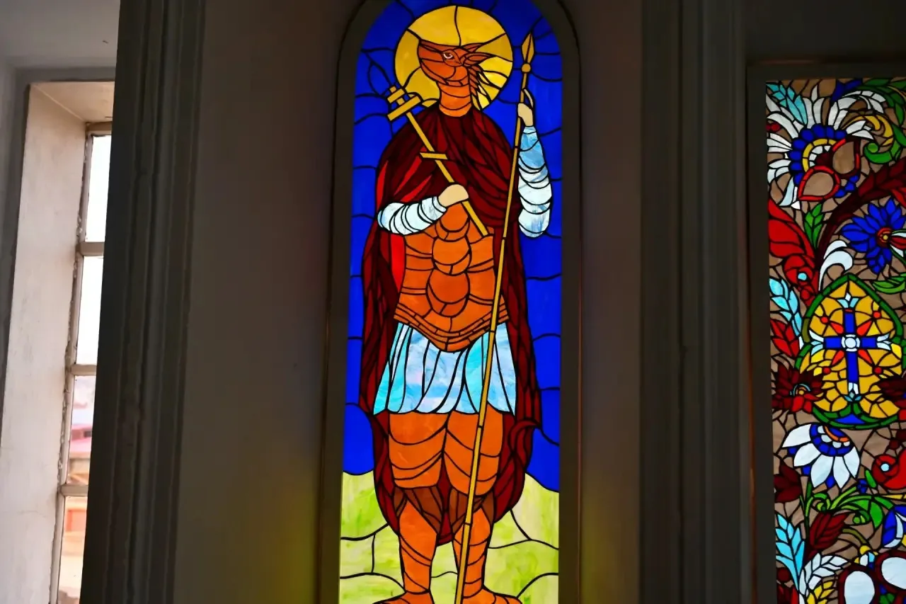 А сейчас здесь реализуют уникальный проект — «Пермские вехи. Кудымкар и Чердынь. Песнь мифов». Воссоздают в стекле религиозные сюжеты по мотивам фресок храма и икон, в том числе с изображением Святого Христофора-Псоглавца, которая хранится в музее.