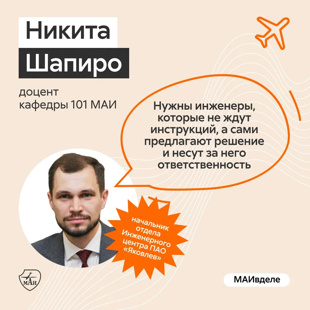 В рубрике #МАИвделе — интервью с доцентом кафедры 101 МАИ Никитой Шапиро — руководителем отдела эскизного проектирования Инженерного центра ПАО «Яковлев».