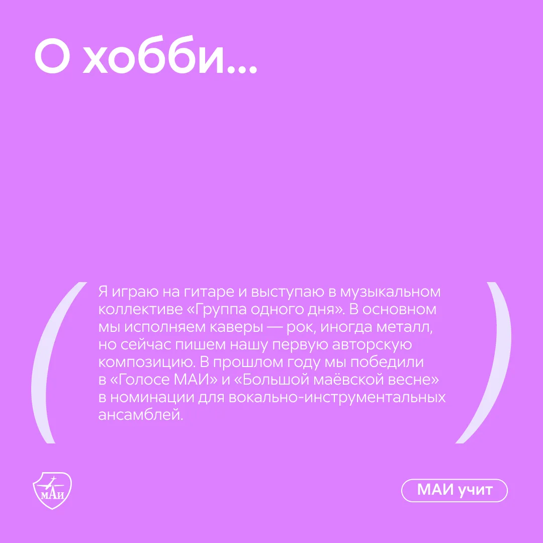 Он может добавить не только авиационных терминов, но и рока в ДКиТ: любит играть на гитаре и в составе группы не раз становился победителем университетских конкурсов.