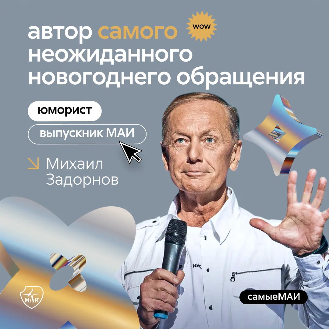 Писатель-сатирик, драматург, юморист и актёр окончил институт № 2 МАИ в 1974 году. После выпуска, кстати, не сразу оставил чертежи ради сцены, а ещё четыре года проработал на 202-й кафедре инженером. Но гораздо больше запомнился вклад Михаила Задорнова в творческую жизнь университета. Ещё во время учёбы он создал в МАИ агиттеатр «Россия», где ставил спектакли на актуальные и порой даже острые темы.