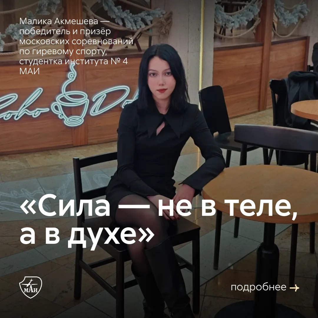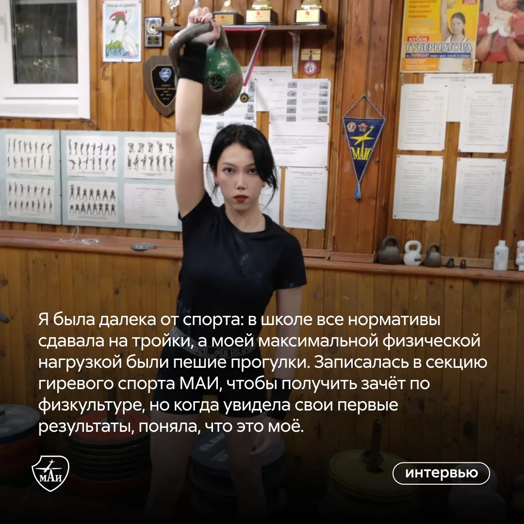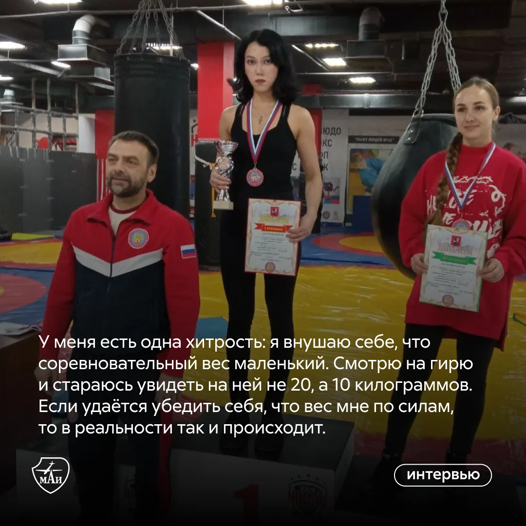 В прошлом году на фестивале силовых видов спорта МАИ студентка института № 4 Малика Акмешева стала чемпионкой по поднятию гирь. Её веру в себя укрепили серебро Московских студенческих спортивных игр и победа на Кубке Москвы.