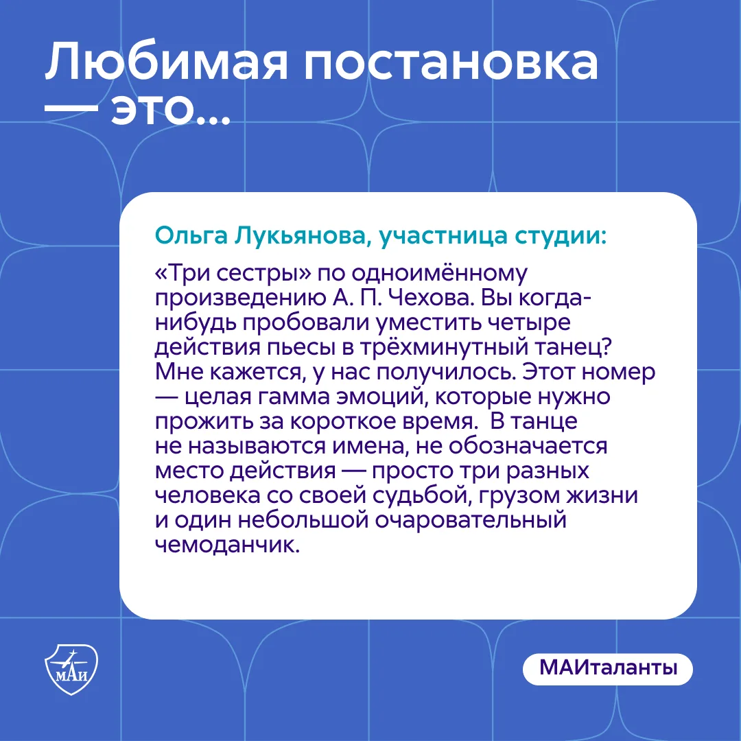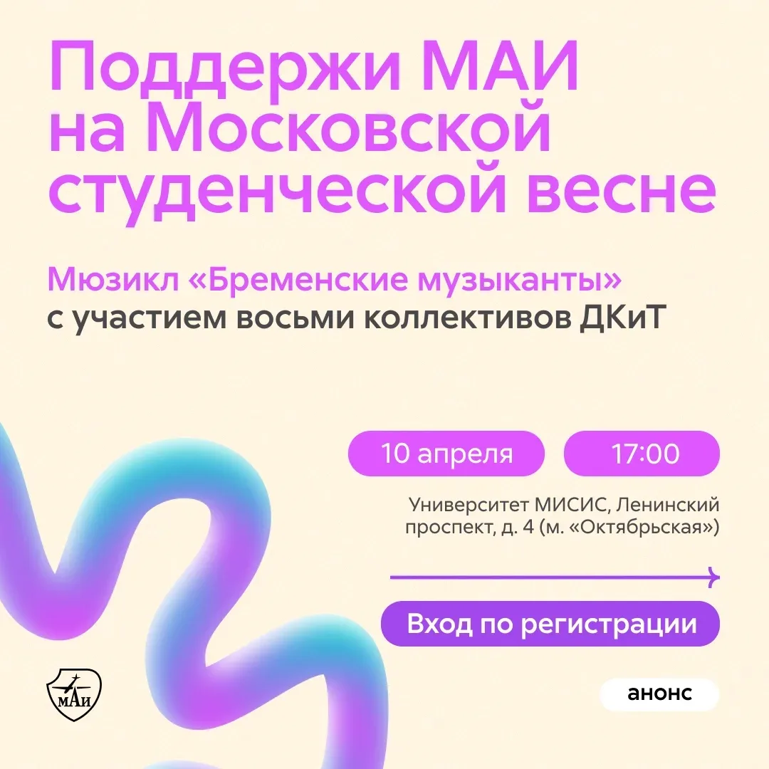 С тебя — маёвский дух и самые громкие аплодисменты. Взамен — заряд творчества от коллективов ДКиТ: театральной студии STS, ансамбля «Энтузиасты», студии эстрадного танца «Сокол», танцевальных групп «О’крошка», Flow, Breaking engineers, Heat waves, 1 More time и участницы «Мисс и Мистер МАИ — 2025» Камиллы Когай. Покажем всем, как даёт концерты МАИ ✈️