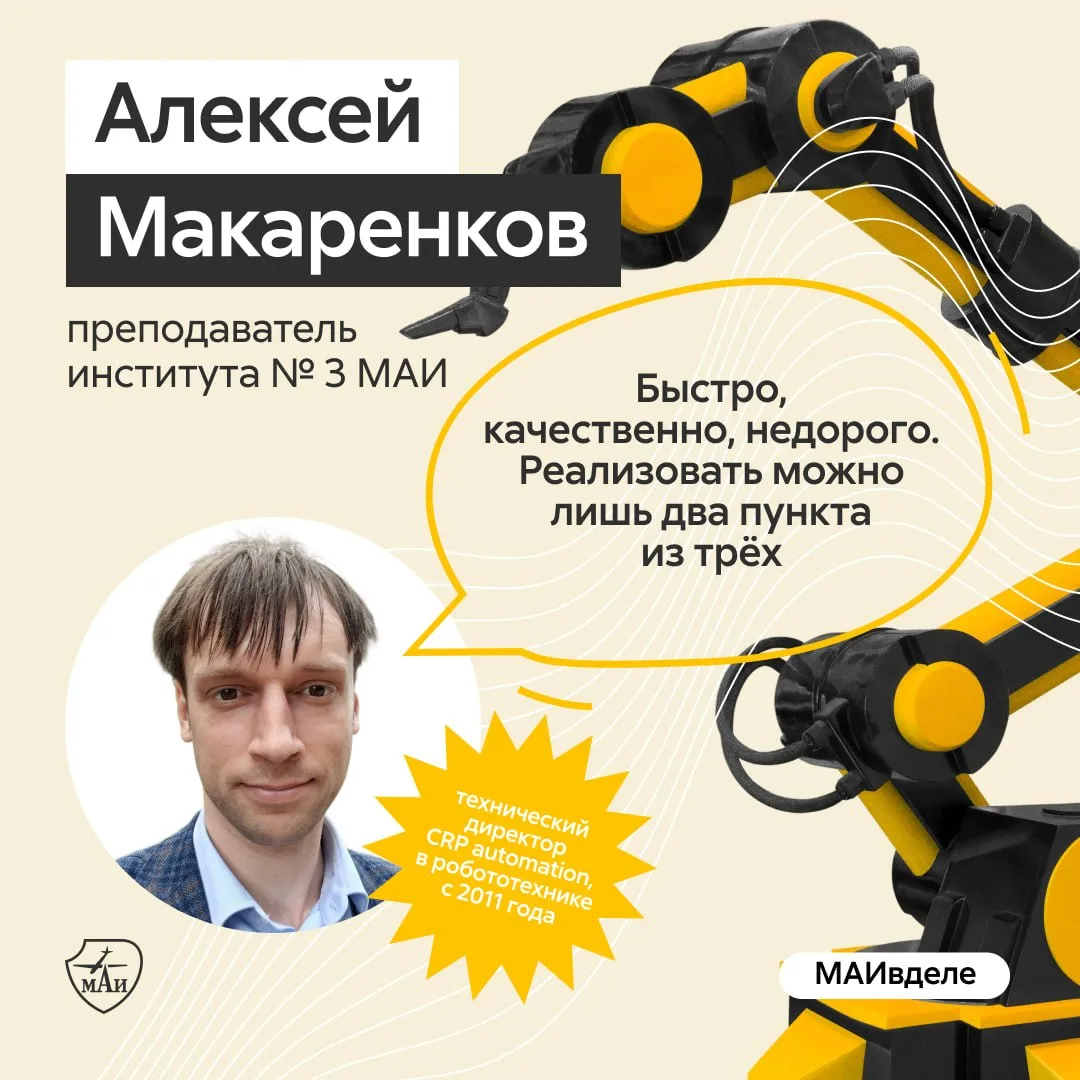 Почему Алексей Макаренков намеренно «ломает» роботов, заставляя студентов паниковать, и какие советы он даёт всем, кто мечтает быстрее освоиться в робототехнике, — читайте в интервью для рубрики #МАИвделе.