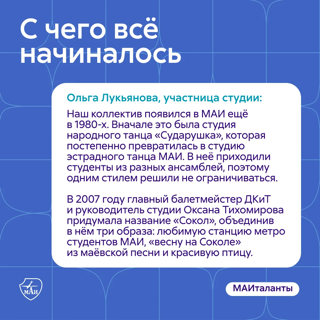 Это символичное название нашло танцевальную студию ДКиТ МАИ спустя несколько десятков лет её существования. Хореографический коллектив появился ещё в 1980-х, выступал в народном стиле, и тогда его знали как «Сударушку». Всё изменилось, когда в студию стали приходить ребята из разных ансамблей. Коллектив вышел за рамки одного направления и сменил имидж, став «Соколом».