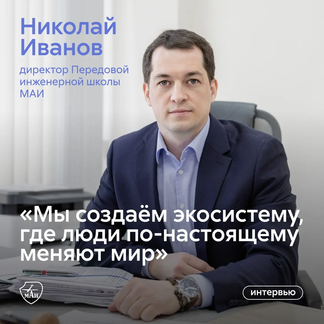Николай Иванов — кандидат технических наук, член-корреспондент АЭН России — был назначен директором Передовой инженерной школы Московского авиационного. За его плечами — не только научная деятельность, но и многолетний опыт руководства НИО-310 и лабораторией «Гибридные и электрические силовые установки» ПИШ МАИ.