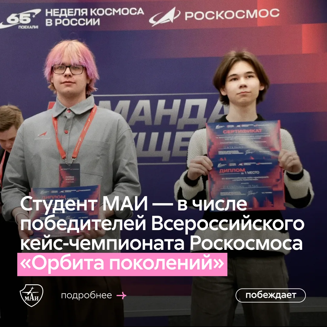 Студент института № 6 МАИ Илья Батарин в составе своей команды победил во Всероссийском кейс‑чемпионате Роскосмоса «Орбита поколений». Соревнования прошли в МАИ и открыли цикл мероприятий в рамках Недели космоса в университете.