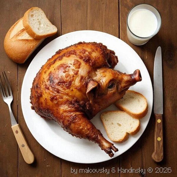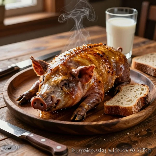 Прошло почти полтора года после последнего использования моего любимого "жареного поросёнка" в качестве неизменного промпта. Как обычно был использован один и тот же запрос для четырёх нейросетей и каждая из них по этому запросу сгенерировала по 3 изображения. Этот промпт неизменен уже более 2 лет и принадлежит к категории простых, что позволит без излишней детализации в сложных промптах оценить работу испытываемой нейросети. Конечно, основную роль в оценке играет неизменность задания - по результату генераций сразу видны изменения как нейросеть понимает запрос и как она его отрабатывает.