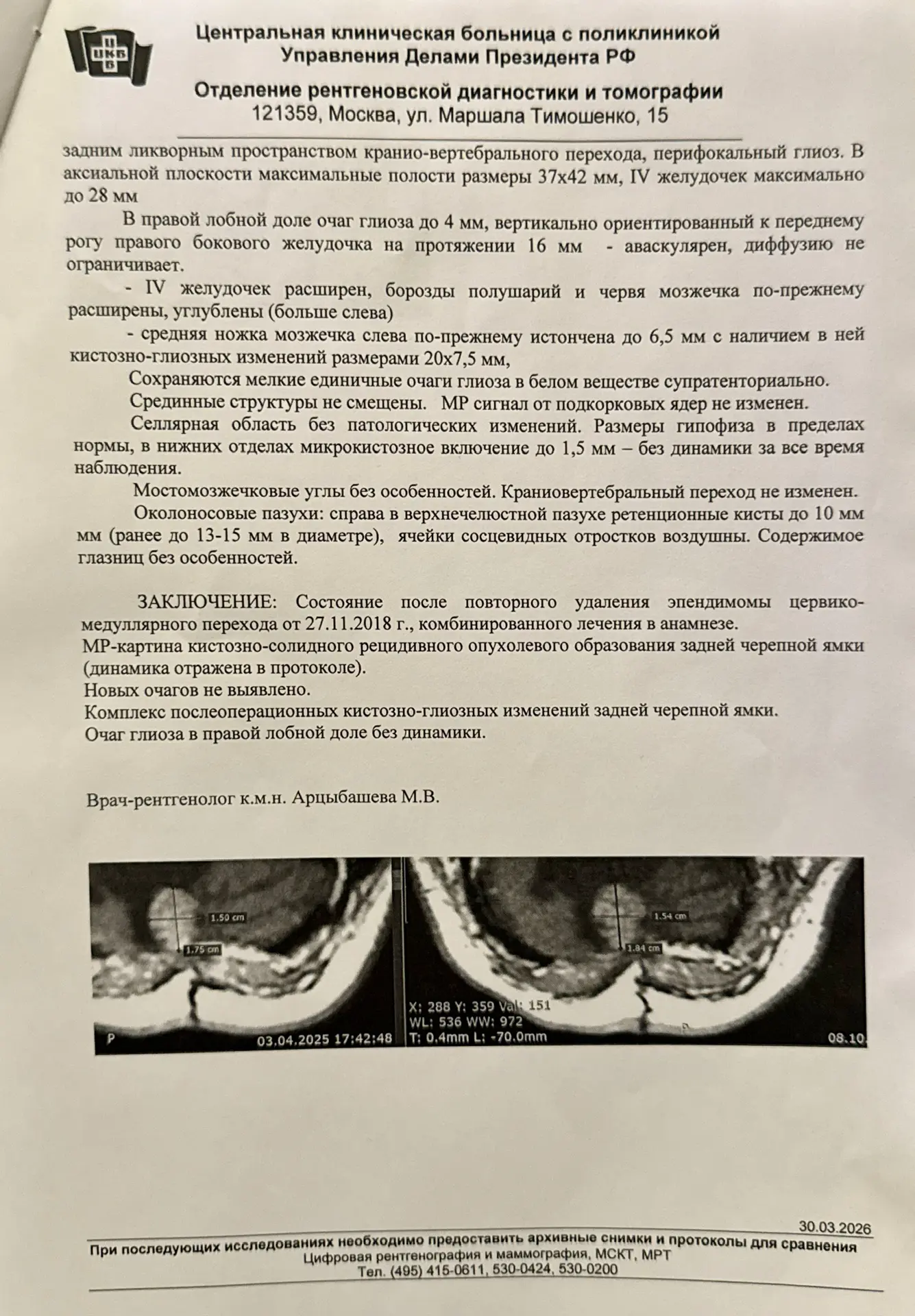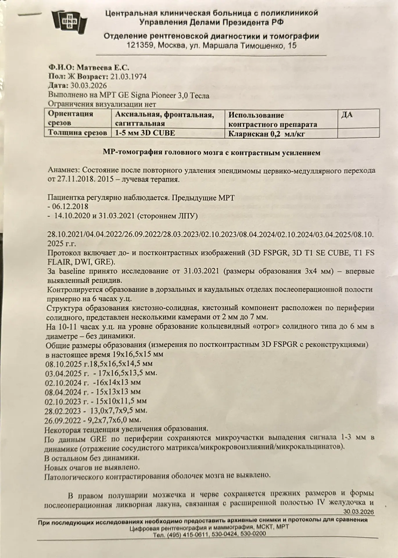 Если вы спросите “Может стоит подключить какой-нибудь химический метод (химия, таргет, иммунка) или кибер/гамма нож?”, я отвечу: “почитайте мою статью об особенностях анапластической эпендимомы 3 степени”, там есть ответ, а коротко - химия ее не берет, а кибернож в моем случае не использовать”.