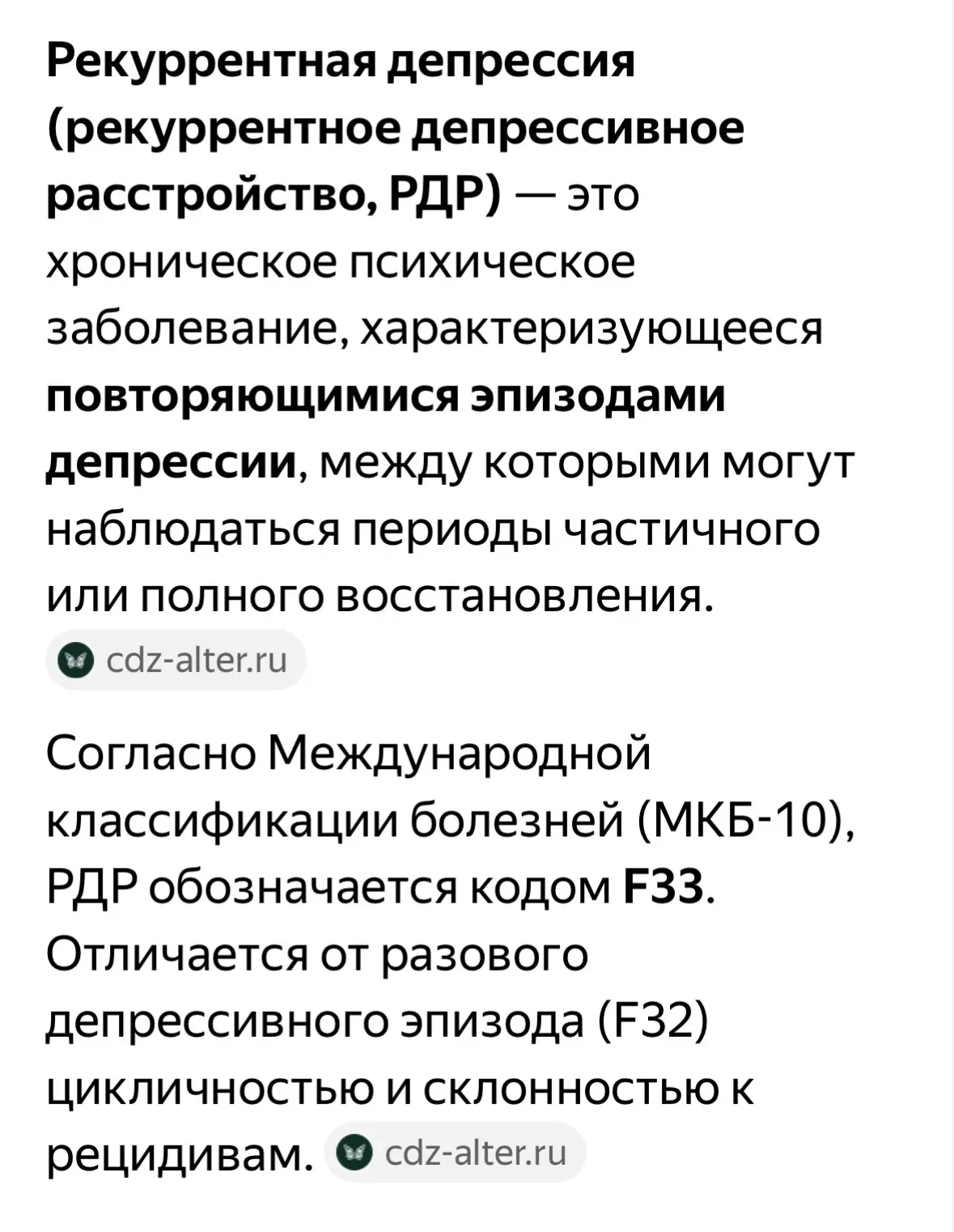Да, коротко о заключение и диагнозе от психиатра. У меня рекуррентная депрессия. Или ее еще называют "монополярная биполярка" - это когда либо ровно на душе, либо очень плохо (минус) без подъема психо-эмоционального состояния наверх (в плюс)