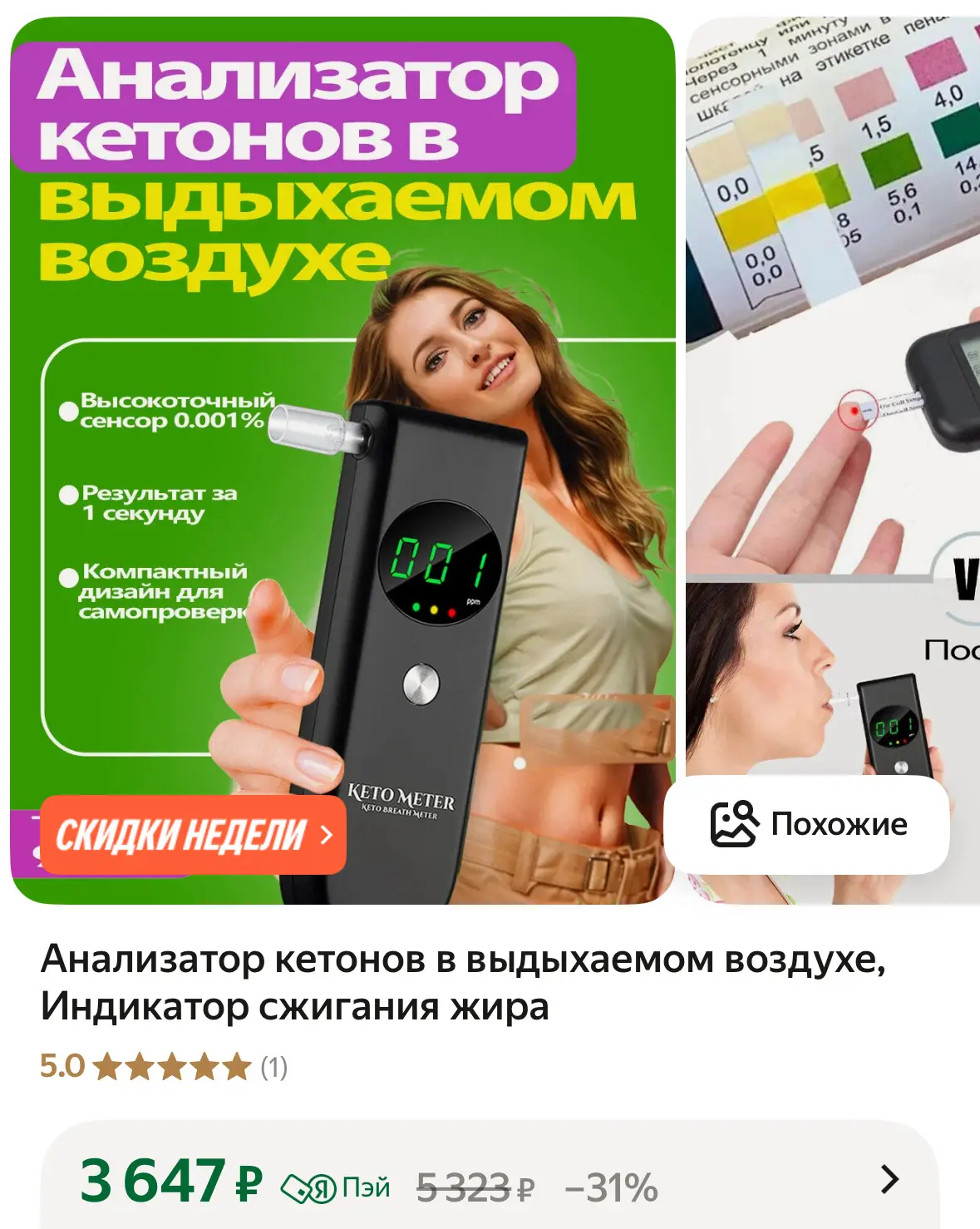 Лучше бы заказали с долгой доставкой из-за рубежа глюкометр-кетометр по крови. Они всегда дают наиболее точные результаты для домашних отслеживаний. Правда, почему-то их нет у нас в РФ и все маркетплейсы предлагают только доставку из-за рубежа. Но мы сами виноваты: «поспешишь — людей насмешишь». Зато теперь учёные уже))) и мне есть чем с вами поделиться и от сего предостеречь. Не покупайте. Не тратьте денег. Он только запутает вас.