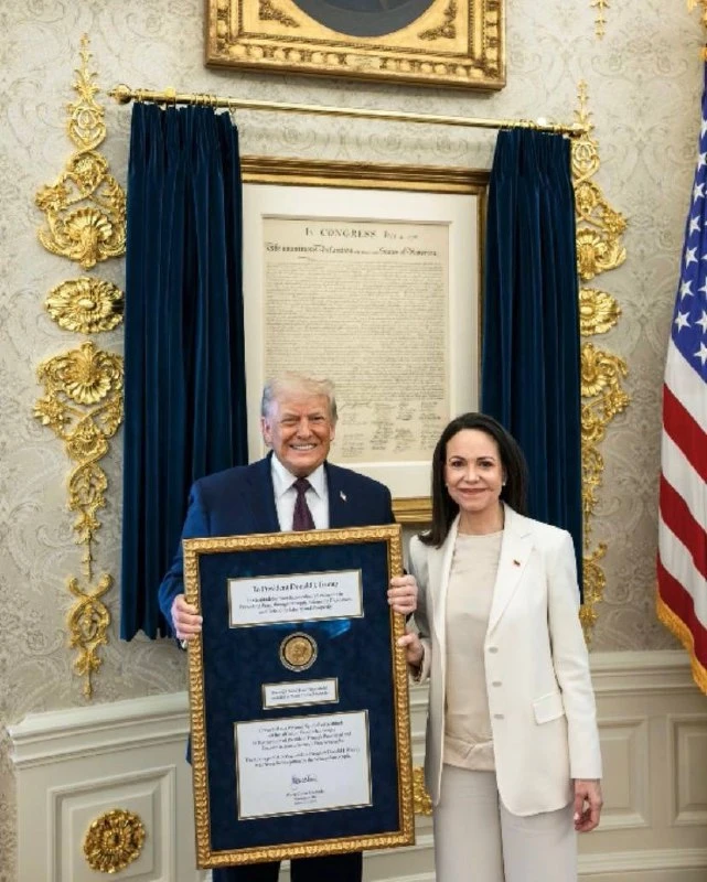 Трамп принял Нобелевскую премию мира от лидера венесуэльской оппозиции Мачадо. Фото опубликовал Белый дом.