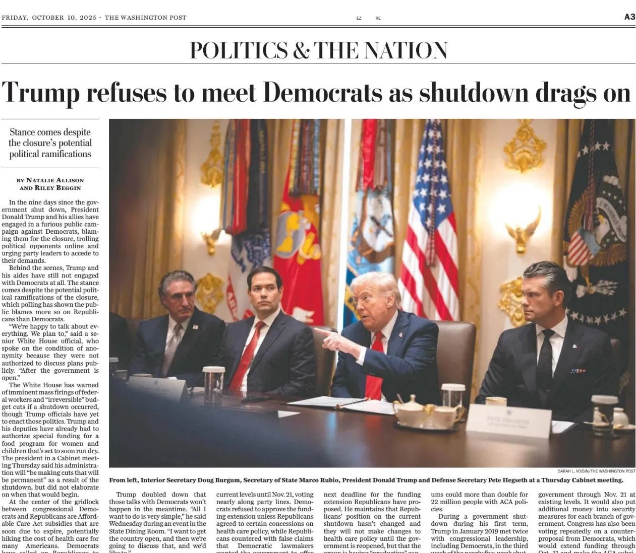 Вся эта буффонада из-за субсидий на медицинскую страховку. Трамп заявляет, что «ведет переговоры», но демократы в Сенате с удивлением узнают об этом из его твитов.