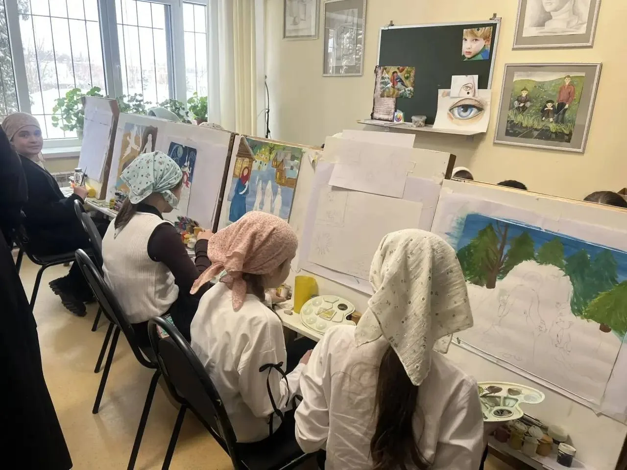 Изостудия «Белый Цветок» и сама школа работают с 2019 года, сейчас здесь занимаются 25 детей. По воскресеньям отец Георгий преподаёт ребятам Закон Божий. Юные дарования уже громко заявили о себе: трое воспитанников заняли третье место на международном конкурсе «Красота Божиего Мира» при Калужской Епархии, а их работы украшают Пасхальные и Рождественские выставки в Калужском ТЮЗе.