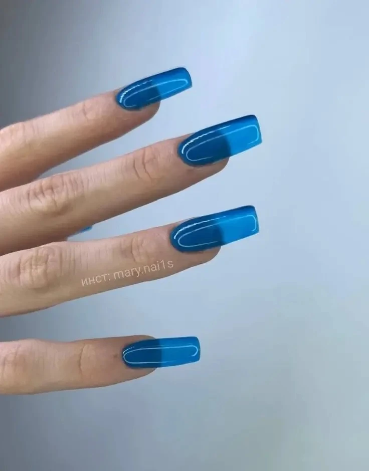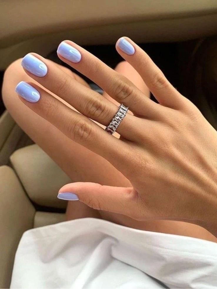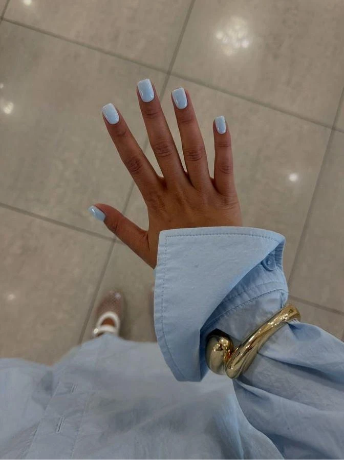 Выбеленный голубой без неона. На коротких ногтях выглядит чисто и опрятно, дружит с серебром, холодными тонами в одежде и мягким загаром.