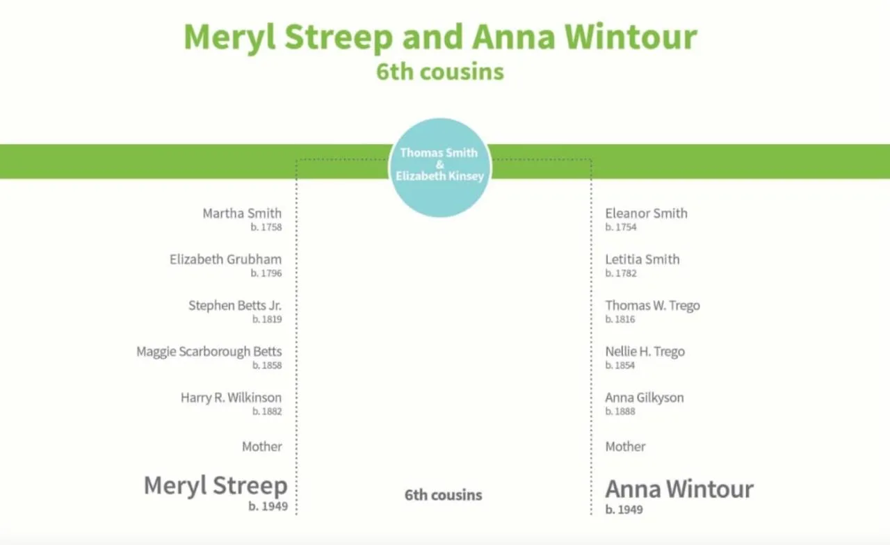 Да, вы не ослышались. Генеалоги нашли у них общих предков, Томаса Смита и Элизабет Кинси из Пенсильвании. Теперь понятно, откуда у Миранды Пристли такая харизма: видимо, передалась по ДНК.