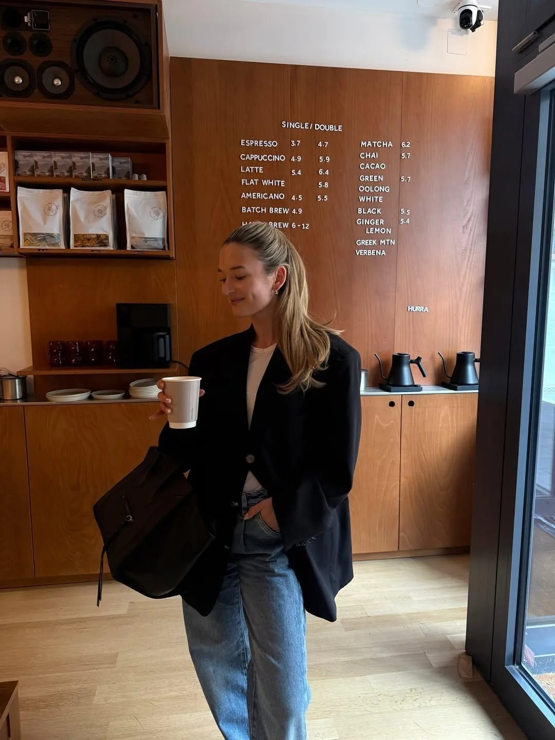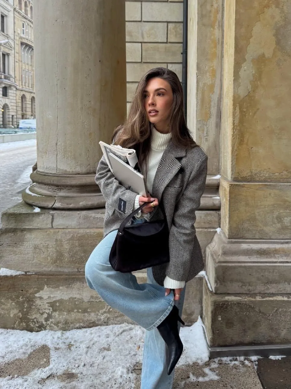 Личный выбор редакции: приталенный жакет с лацканами и поясом + джинсы-клеш в тон + остроносые казаки.