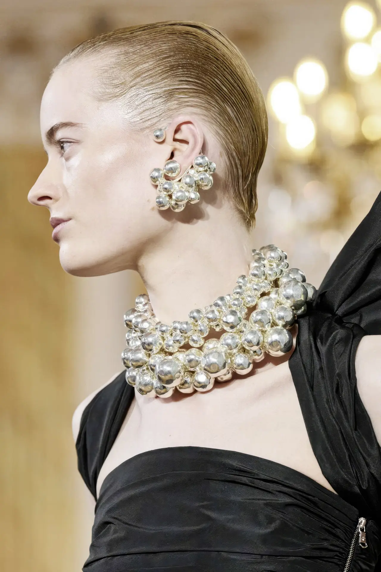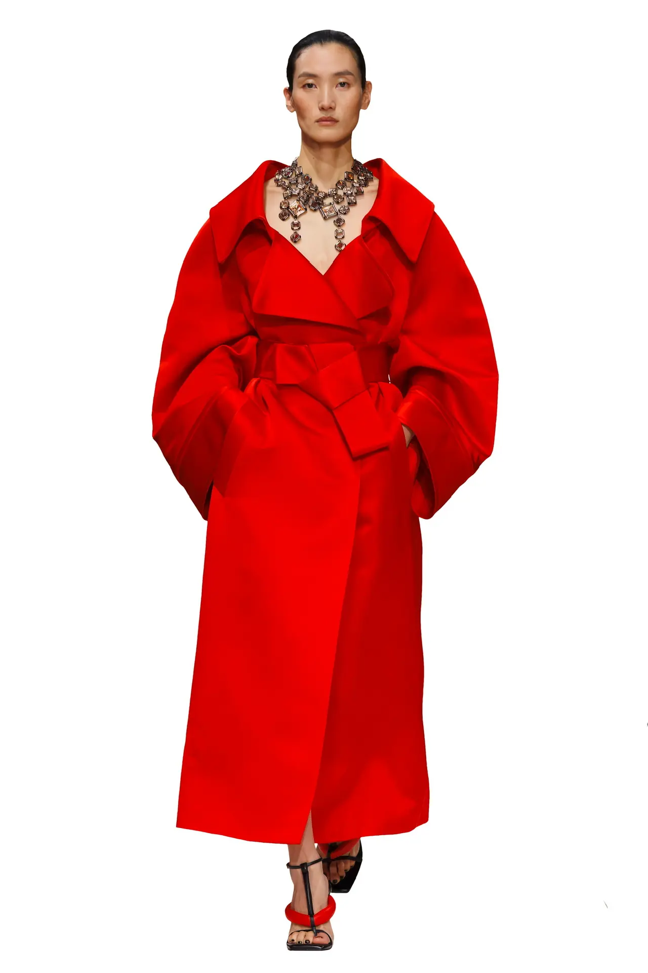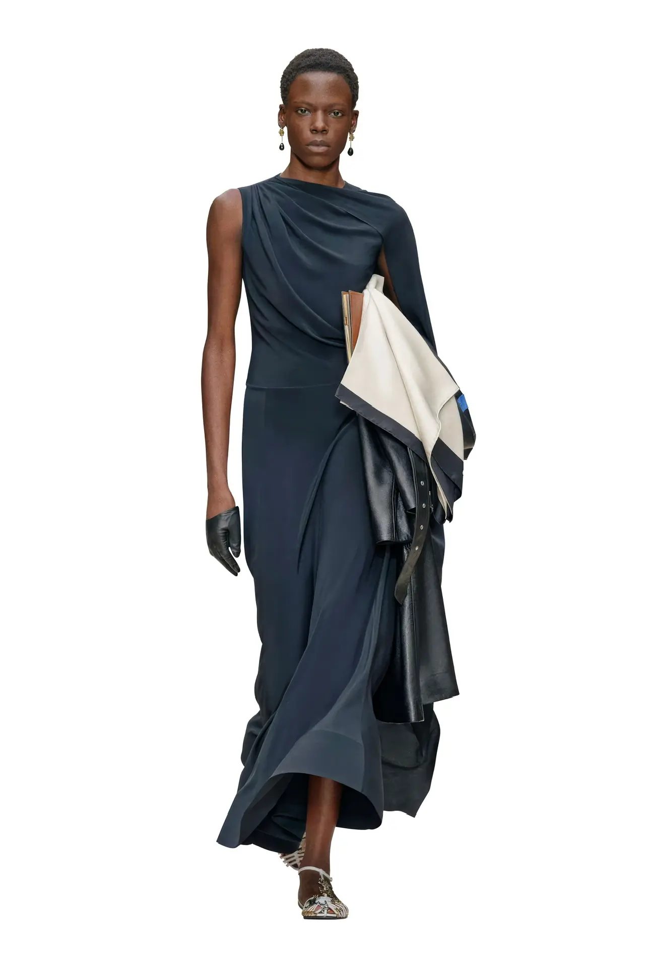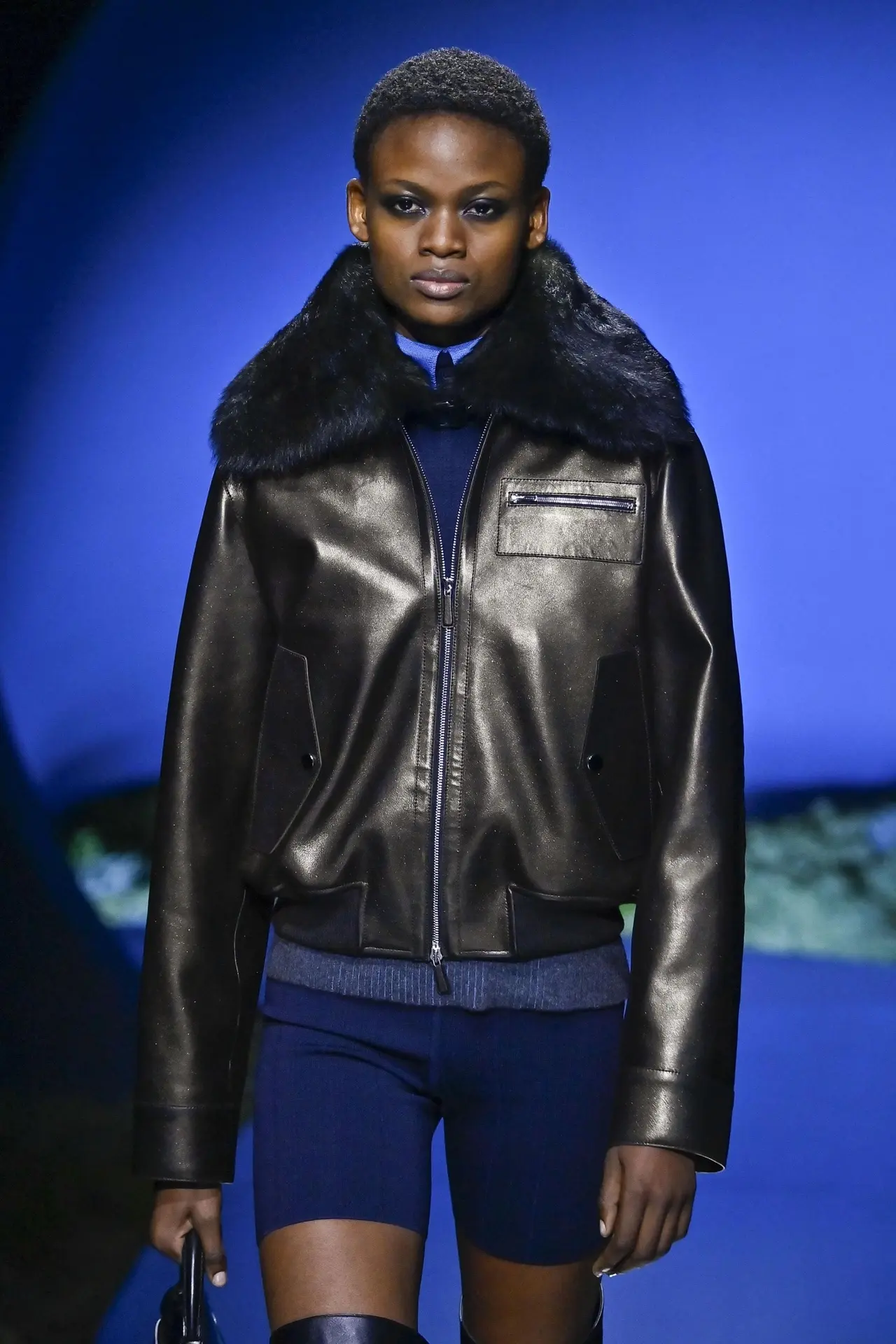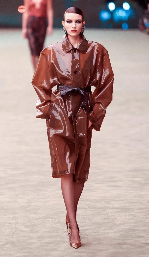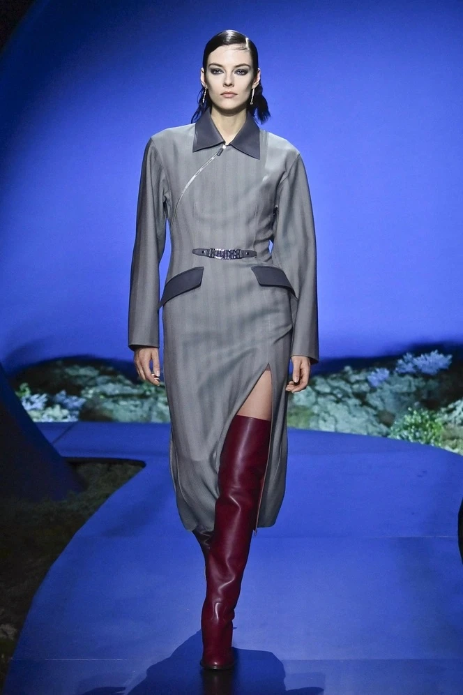 Вещи выходят как продолжение сцены: острый крой, мини с ботфортами, кожаные плащи для ночных прогулок. В палитре — густые синие, лесные зеленые, глубокие бордо и угольные оттенки.