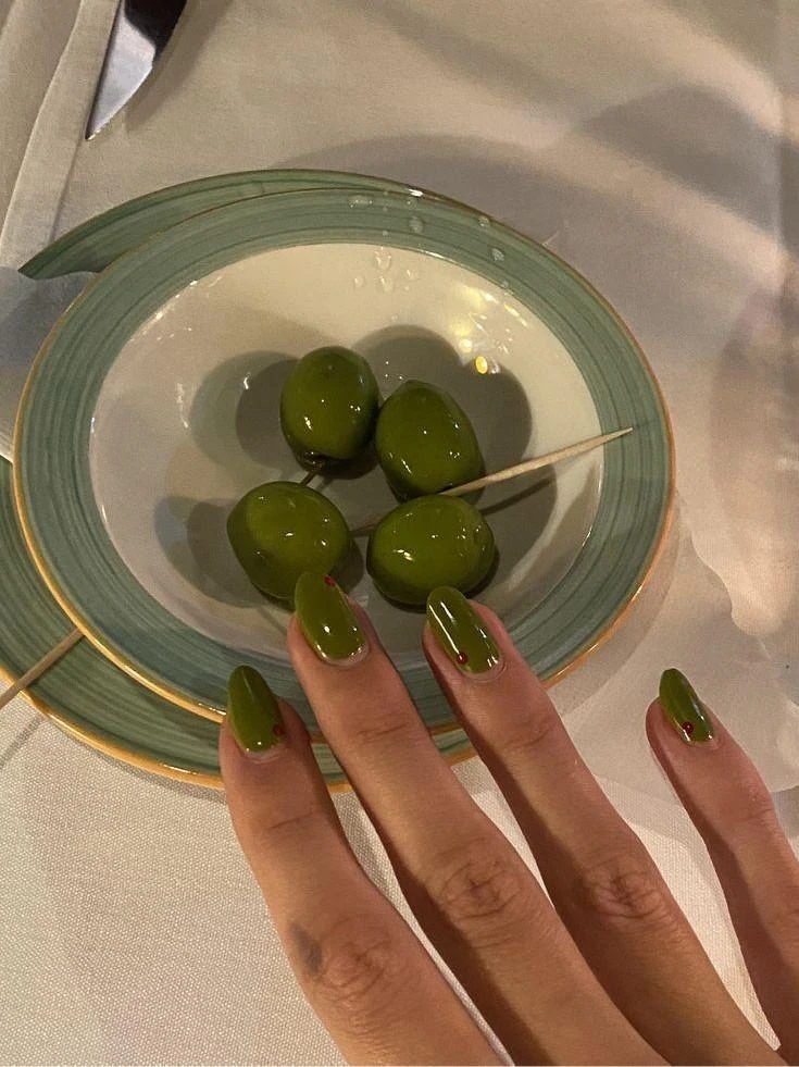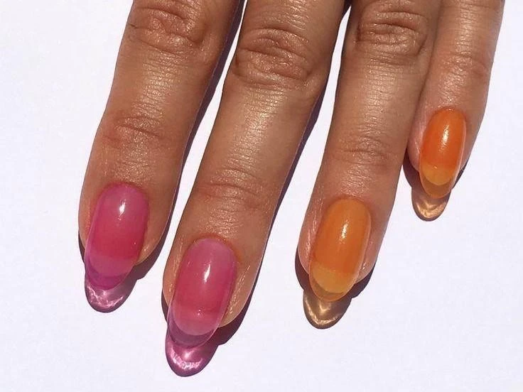Впервые его показали на шоу Off-White осень-зима 2026. Главная фишка: ногти выглядят так, будто их покрыли тонким слоем цветного стекла. Особенно это заметно на кончиках: там покрытие становится почти прозрачным.