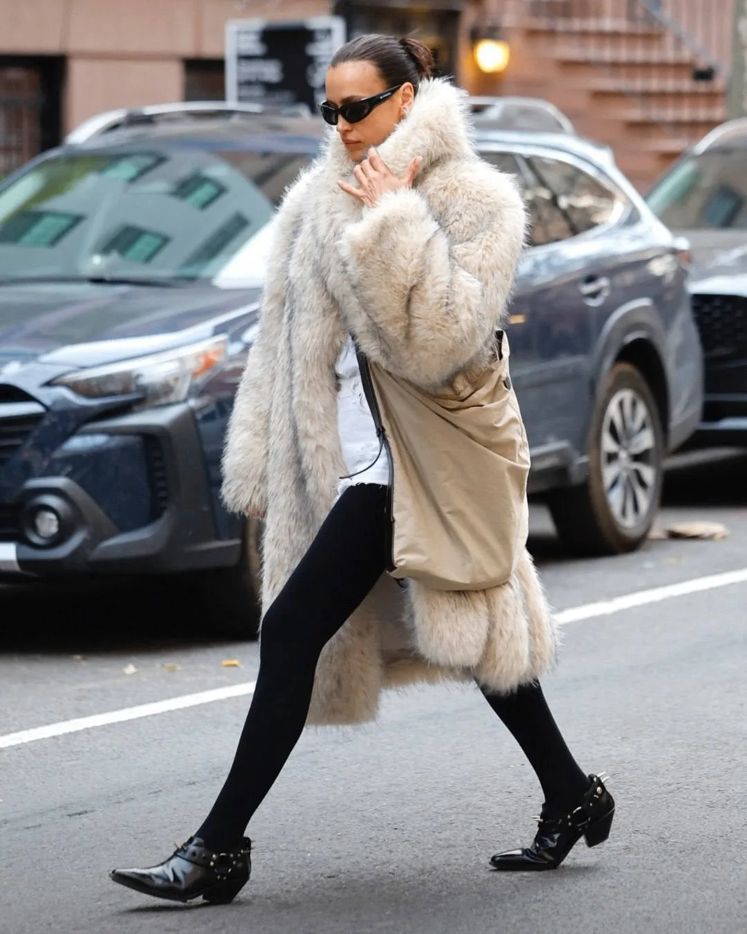Модель заметили в Нью-Йорке в объёмной светлой шубе. Как вам?