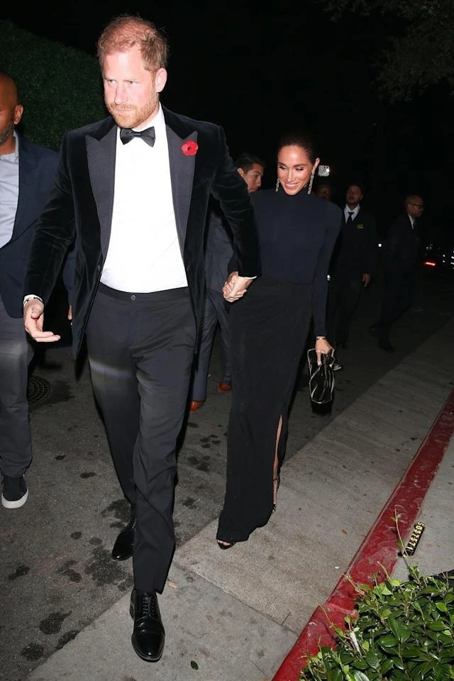 Актриса надела чёрное сияющее платье от Ralph Lauren, а её спутник предпочёл классический костюм со светло-голубой рубашкой.
