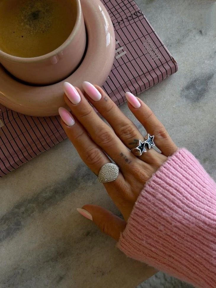Холодный молочно-розовый с полупрозрачной текстурой. Цвет как свой, только ровнее и подсвеченнее. Впишется и в офис, и в casual.