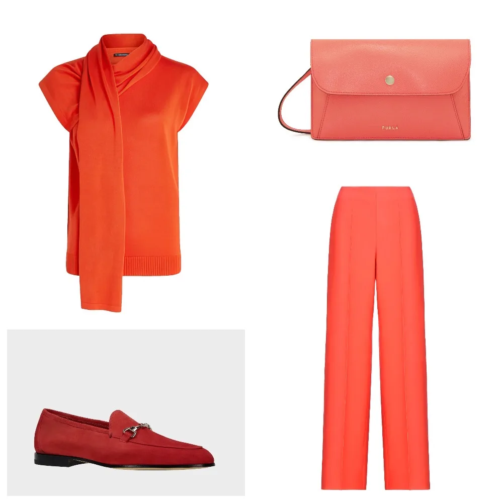 Цвет, который заменяет помаду и не требует сложной стилизации. Белая рубашка, серый свитер или простая майка хорошо дополнят образ, а вечером надеваем пиджак с четкими плечами и босоножки.