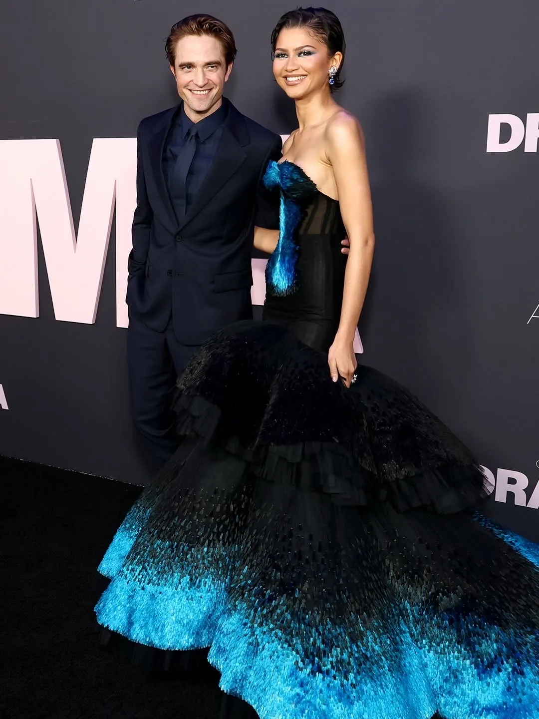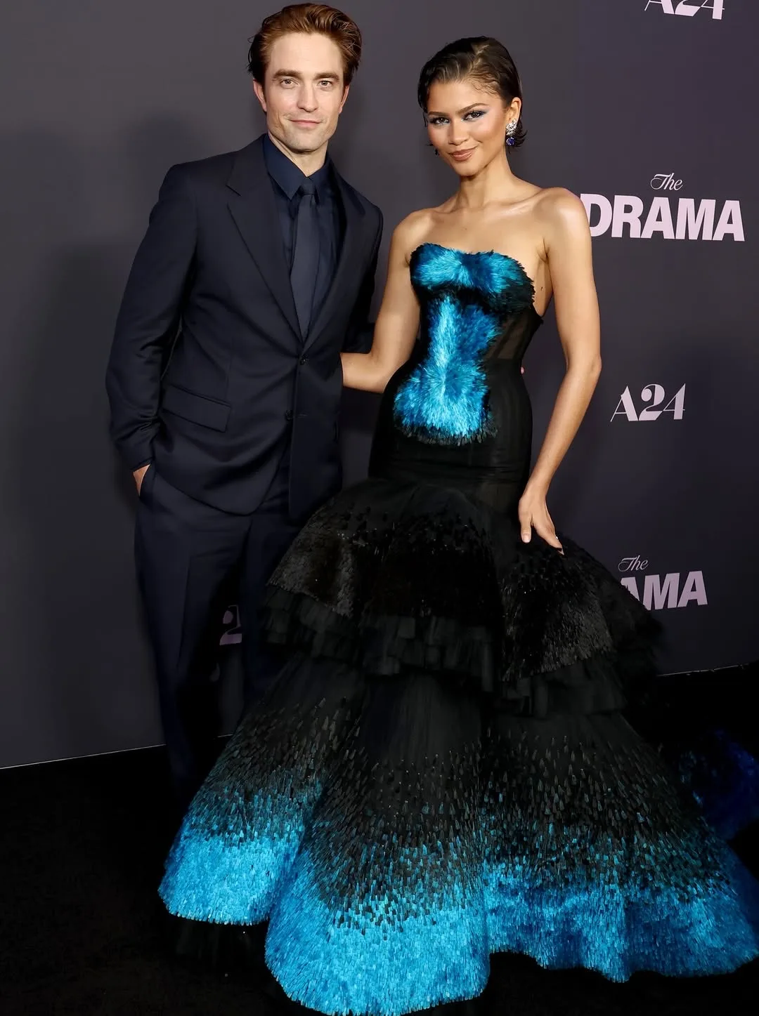 На финальной премьере актриса вышла в голубом перьевом платье Schiaparelli из весенней коллекции Дэниела Розберри, дополнив его пернатыми каблуками. Роберт Паттинсон ожидаемо в Dior.