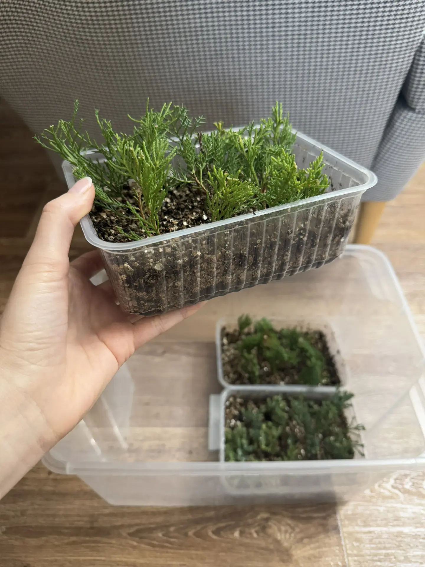 Почеренковала можжевельники, 4 вида. Взяла небольшие побеги, укоротив немного зеленую массу. Втыкаю во влажную смесь грунт+вермикулит (процентное соотношение не подскажу, сделала наобум, примерно 50/50). Вермикулит хорошо держит влагу, в нём обычно неплохо укореняется. Поставлю свои плошки в контейнер и закрою крышкой. Периодически буду в него заглядывать и проветривать. Поставила контейнер пока что просто дома под комод подальше от батарей😶