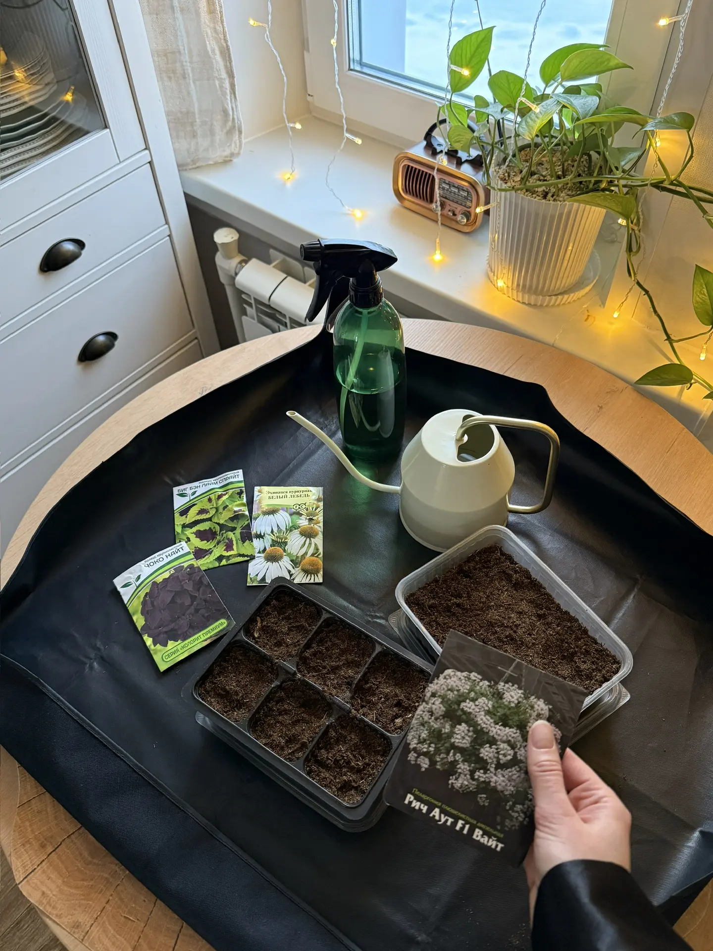 Посеяла семена во влажный грунт, контейнеры подписала. Накрываю крышкой или пакетом, создавая парничок. Убираю на окно. Как только начнут появляться ростки - начну досвечивать фитолампой.