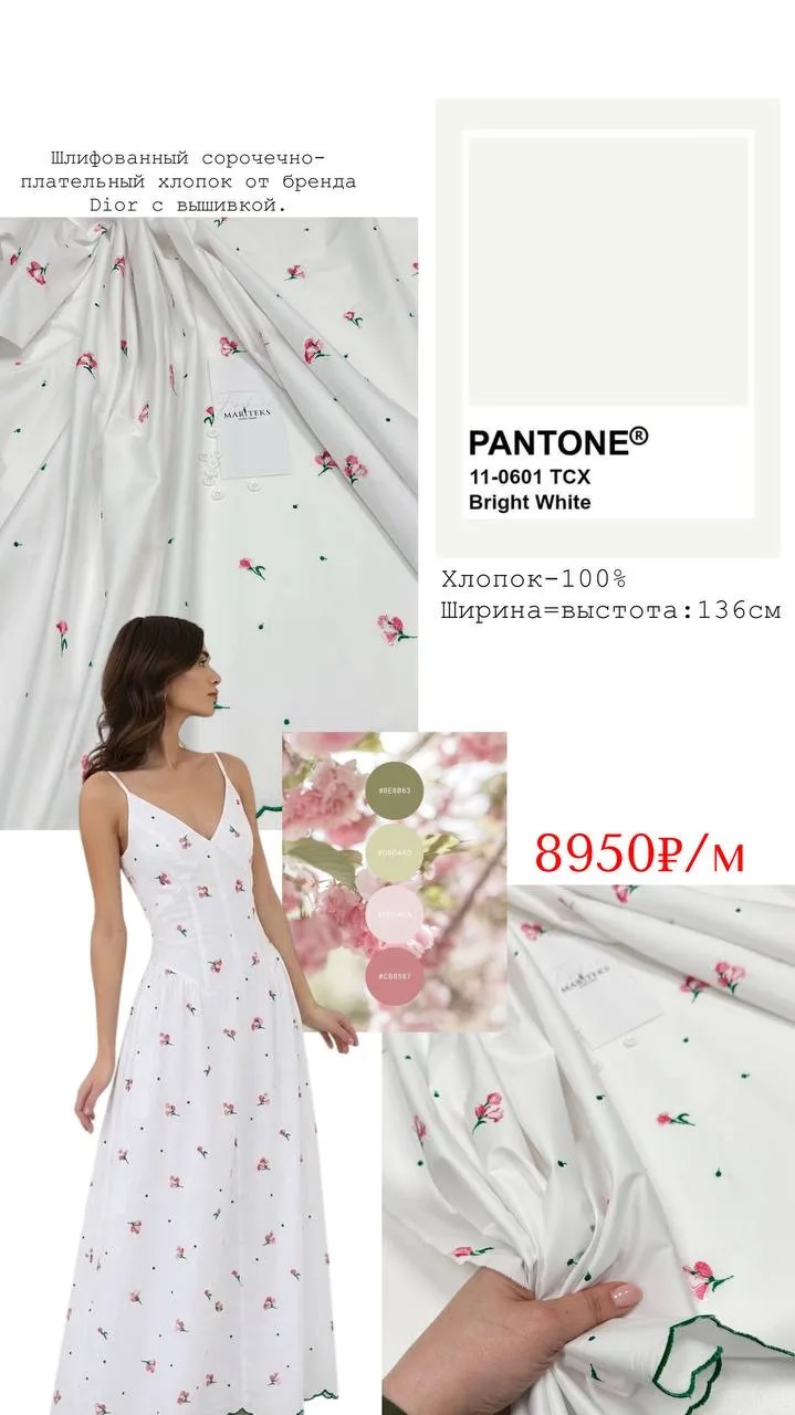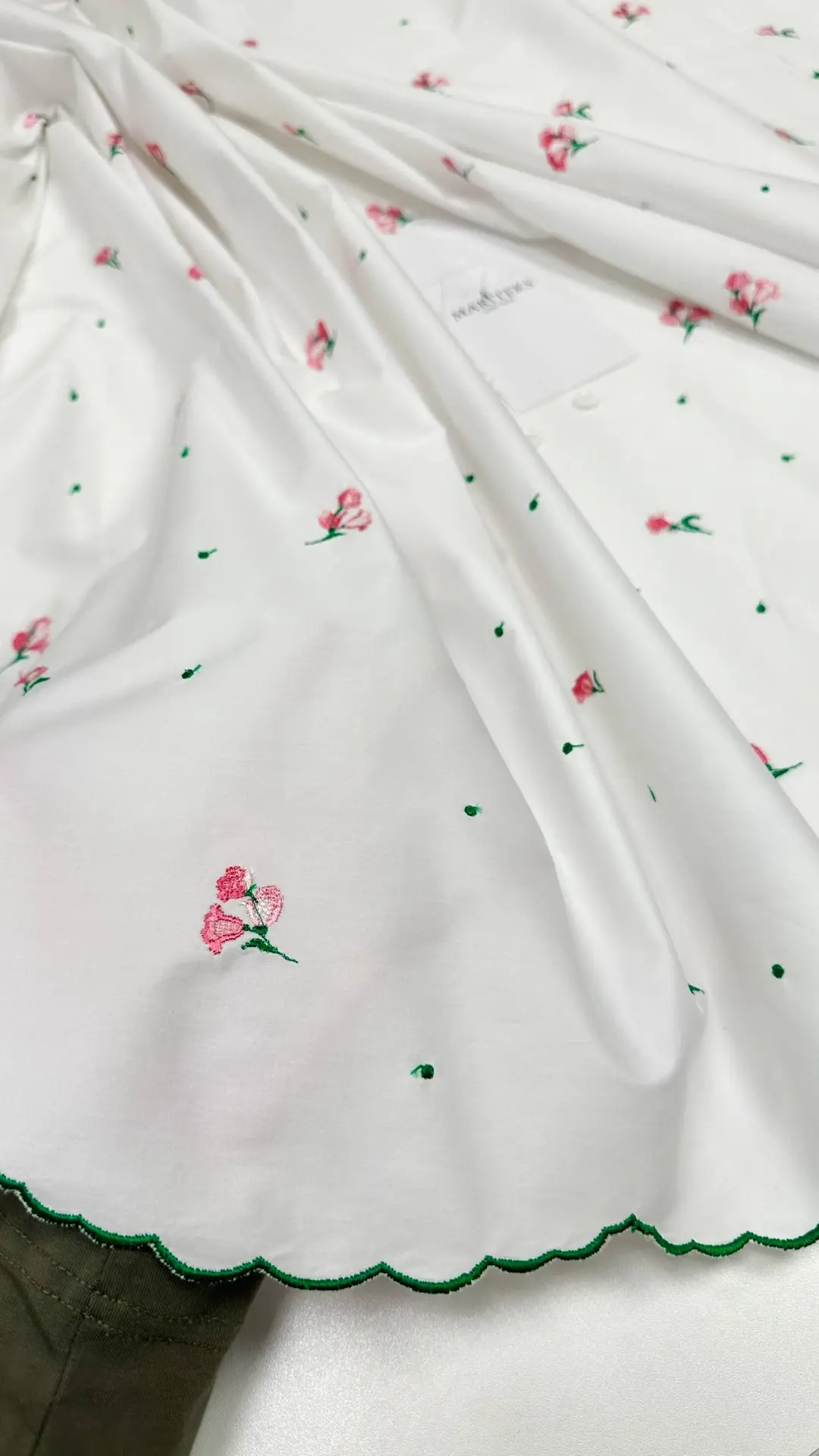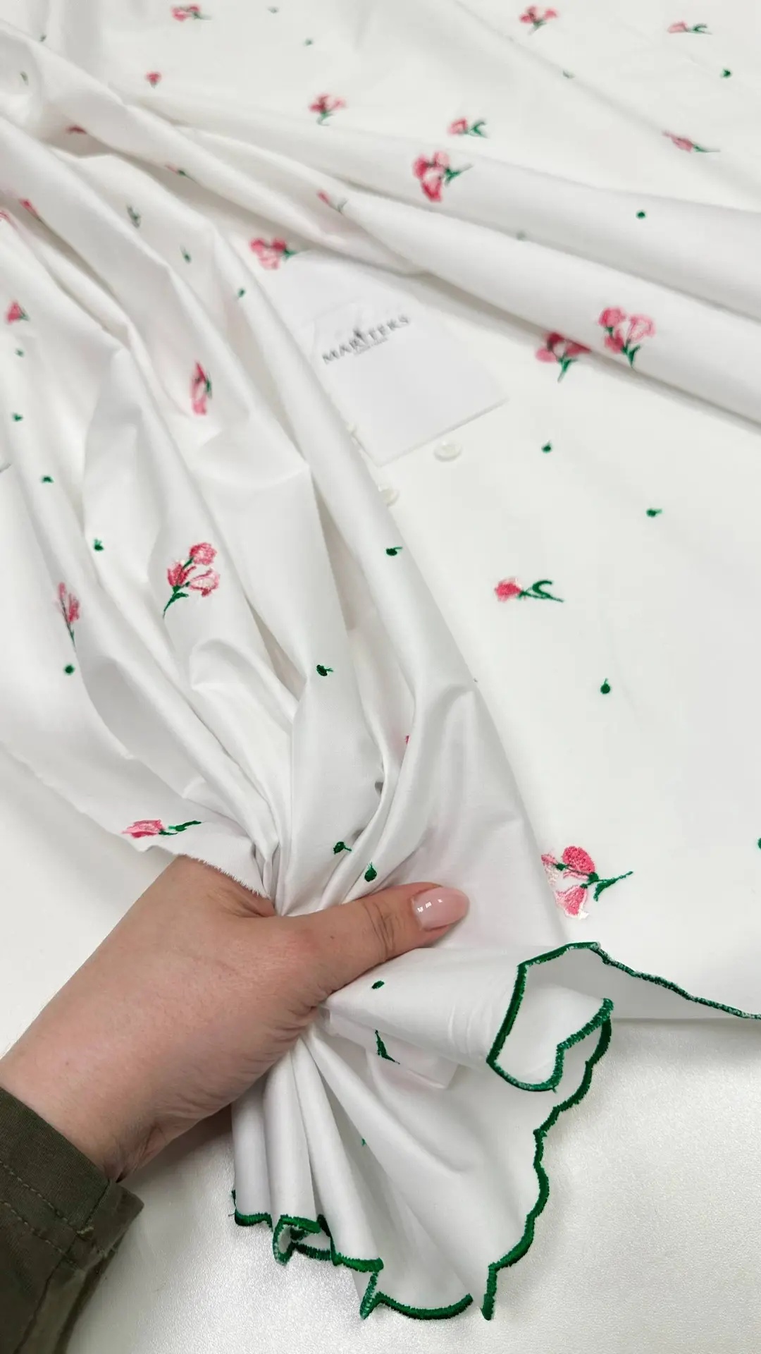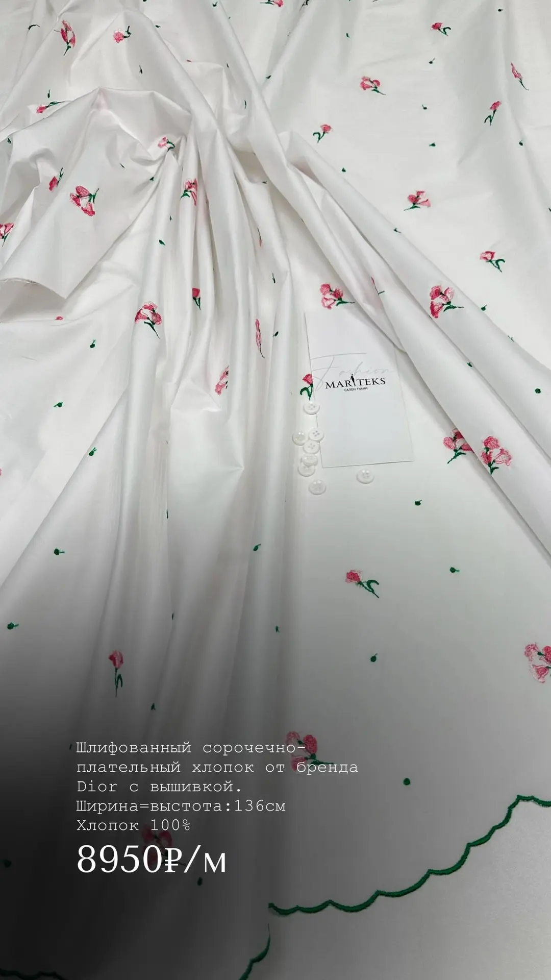 Шлифованный сорочечно-плательный хлопок от бренда Dior с вышивкой. Вышивка в виде бутонов и мелких зеленых горошков. По кромкам с двух сторон расположен нежный фестон. Для самых нежных образов 🥰