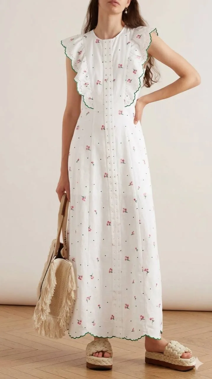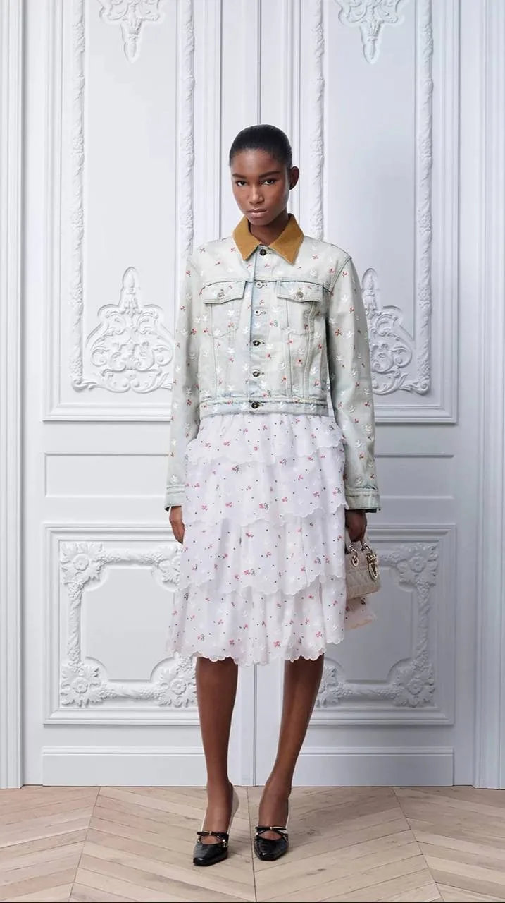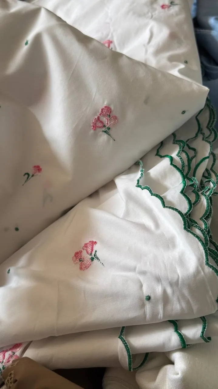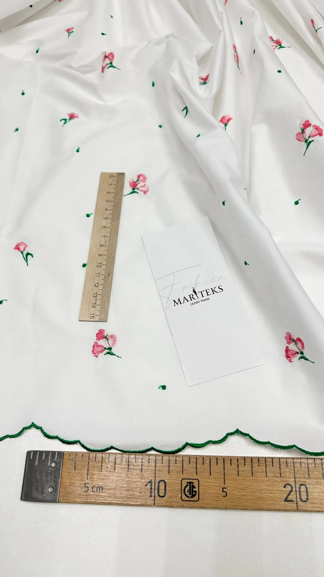 Шлифованный сорочечно-плательный хлопок от бренда Dior с вышивкой. Вышивка в виде бутонов и мелких зеленых горошков. По кромкам с двух сторон расположен нежный фестон. Для самых нежных образов 🥰